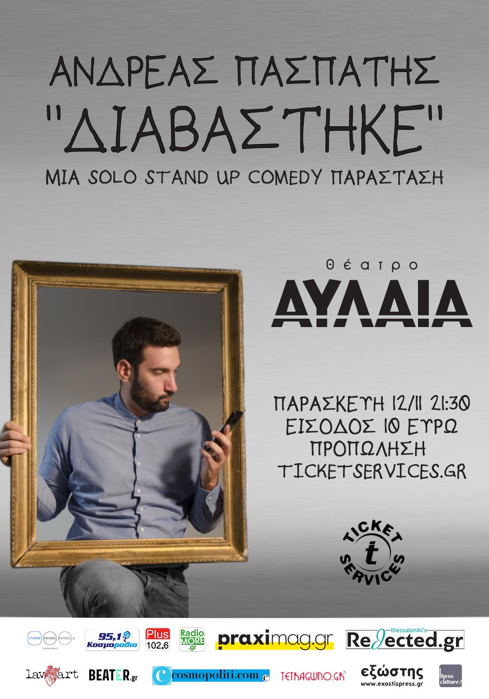 Ο Ανδρέας Πασπάτης, ένας κωμικός με μεγάλη πορεία στην ελληνική stand up comedy σκηνή, μετά τη μεγάλη επιτυχία της πρώτης του παράστασης “Τσάι Party”, επανέρχεται δυναμικά με την τελευταία solo stand up comedy παράστασή του με τίτλο “Διαβάστηκε”, για μια και μόνο παράσταση την Παρασκευή 12 Νοεμβρίου στο Θέατρο Αυλαία. Στέλνετε και εσείς μηνύματα και η απάντηση που παίρνετε είναι ότι “διαβάστηκε”; Νιώθετε ότι μιλάτε μόνο εσείς και κανεις δεν θέλει να μιλαει σε εσάς; Μην απελπίζεστε! Ο Ανδρέας Πασπάτης, έρχεται με 80 λεπτά καταιγιστικής κωμωδίας, μιλώντας για καθημερινά θέματα από στοιχήματα και σοσιαλ μιντια μέχρι τη λαϊκή, τους γιατρους και πολλά άλλα, χωρίς αυτή τη φορά να χρειάζεται εσείς να απαντάτε. Με έξυπνο χιούμορ, γρήγορες εναλλαγές θεματολογιών και εύστοχη τοποθέτηση, ο Ανδρέας Πασπάτης σχολιάζει και καυτηριάζει την πιο αστεία πλευρά της καθημερινότητάς σε μια παρασταση που σίγουρα δεν θέλετε να χάσετε.