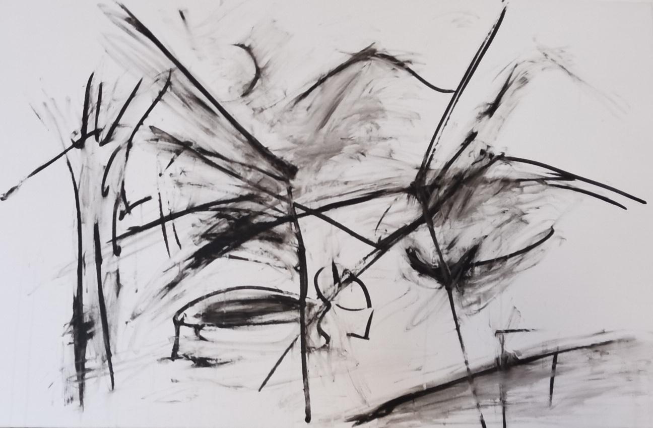 Από την άλλη ο Γιώργος Ξένος εκθέτει μικρή επιλογή από τον όγκο της πιο πρόσφατης δουλειάς του την οποία χαρακτηρίζουν η εμμονή στην αυθόρμητη, άμεση γραφή, στην μεγάλη χειρονομία που αποτυπώνεται μνημειακά πάνω στο χαρτί αλλά και στην αναζήτηση εκείνου του μινιμαλισμού που μπορεί και υπαινίσσεται τα περισσότερα με την λιγότερη, δυνατή φωνασκία. Μαυρισμένοι, κορμοί δέντρων σαν πρωτόγονες, ιερατικές φιγούρες που εκλιπαρούν και ικετεύουν προφητεύοντας τα επερχόμενα, οικεία κακά. Και βέβαια σαν τα συμβολικά ξόανα εκείνης της φύσης την οποία συνέχεια προσβάλλουμε, ρυπαίνουμε και υποβαθμίζουμε. Ο άνθρωπος σταθερά εναντίον του περιβάλλοντος που όμως τον κυοφόρησε και τον προίκισε με αδιανόητη δύναμη! Και είναι ενδεικτικό πως σ’ αυτή την ενότητα των έργων η ανθρώπινη μορφή έχει παραμεριστεί – με μόνη εξαίρεση τον πίνακα με τους πνιγόμενους – για να προβληθεί μέσα από μίαν υπαρξιακή παραφορά του χρώματος, ο φυσικός χώρος αλλά και το αφύσικο δράμα του.