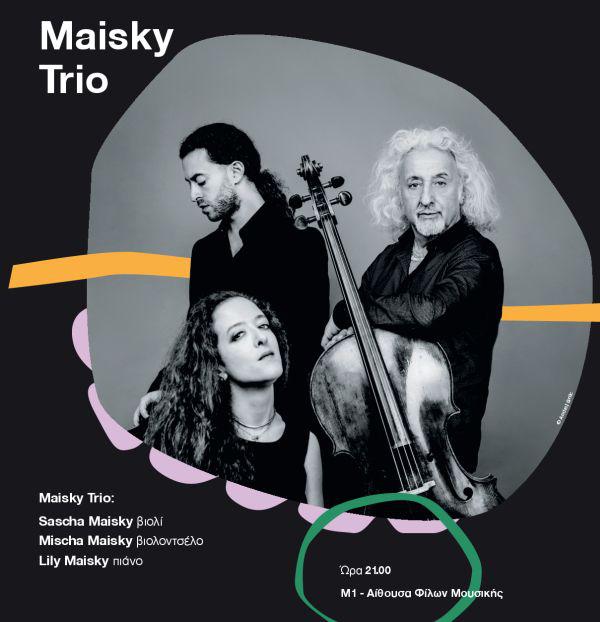 Felix Mendelssohn: Piano Trio αρ. 1 σε ρε ελάσσονα, έργο 49 (1809-1847) i. Molto allegro ed agitato ii. Andante con moto tranquillo iii. Scherzo: Leggiero e vivace iv. Finale: Allegro assai appassionato Το Trio Maisky, αποτελούμενο από τον Mischa Maisky στο τσέλο, την κόρη του Lily στο πιάνο και τον γιό του Sascha στο βιολί έχει καταξιωθεί ως ένα από τα κορυφαία οικογενειακά τρίο πιάνου παγκοσμίως. Οι τρεις τους παίζουν μαζί επαγγελματικά από το 2006 και έχουν εμφανιστεί σε όλον τον κόσμο, περιοδεύοντας στη Νότια Αμερική, την Ασία και όλη την Ευρώπη. Οι συναυλίες τους έχουν φιλοξενηθεί σε πολλούς συναυλιακούς χώρους υψηλού κύρους. Maisky Trio : Sascha Maisky Βιολί Mischa Maisky Βιολοντσέλο Lily Maisky Πιάνο ΤΙΜΕΣ ΕΙΣΙΤΗΡΙΩΝ 25€, 20€, 15€, 10€ (μειωμένο)