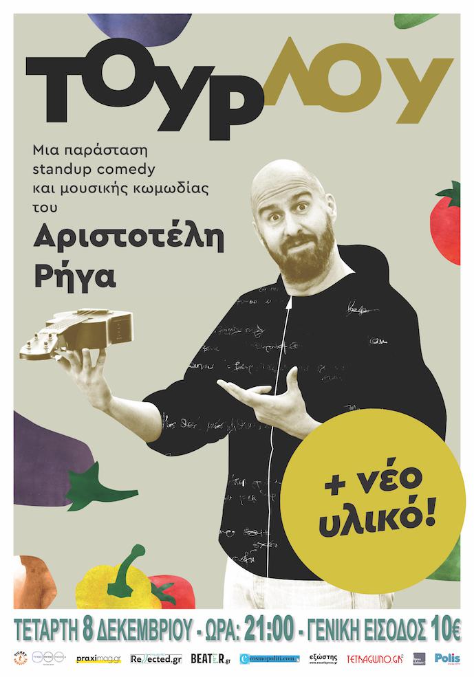 Ο Αριστοτέλης Ρήγας, ένας κωμικός που συνδυάζει μοναδικά το standup comedy και την μουσική κωμωδία, παρουσιάζει το “Tουρλού”, σε ένα μουσικο- κωμικό show που δεν μοιάζει με κανένα. Σε μια από τις τελευταίες ευκαιρίες σας να δείτε την παράσταση, με άφθονο νέο υλικό, παρουσιάζει τα ξεκαρδιστικά του κείμενα που έκαναν sold out παραστάσεις στο Σταυρό του Νότου για δυο σεζόν και όπου αλλού παρουσιάστηκαν σε Ελλάδα και Ευρώπη πριν μας προλάβει η πανδημία. Λογοπαίγνια, σύντομα αστεία, προσωπικές ιστορίες, ευφάνταστες παρατηρήσεις, σουρεαλισμός, μουσική κωμωδία, διασκευές, mashup τραγουδιών και πολλά πολλά άλλα “δένουν” μαζί σε μια παράσταση που έχει κάτι για όλους!