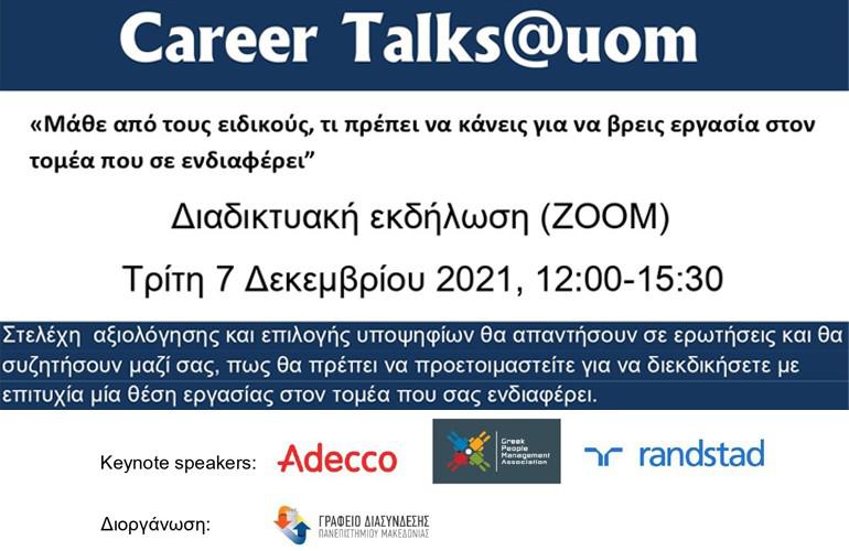 Εξαιρετικά χρήσιμες συμβουλές και στοιχεία που πρέπει να προσέξουν κατά την προετοιμασία τους για ένταξη στην ελληνική και διεθνή αγορά εργασίας, θα παρουσιαστούν σε φοιτητές/τριες και νέους αποφοίτους στη διάρκεια της διαδικτυακής εκδήλωσης «Career Talks@uom», που διοργανώνει αύριο Τρίτη 7 Δεκεμβρίου 2021, από τις 12μ. έως τις 3:30 μ.μ. το Γραφείο Διασύνδεσης του Πανεπιστημίου Μακεδονίας.