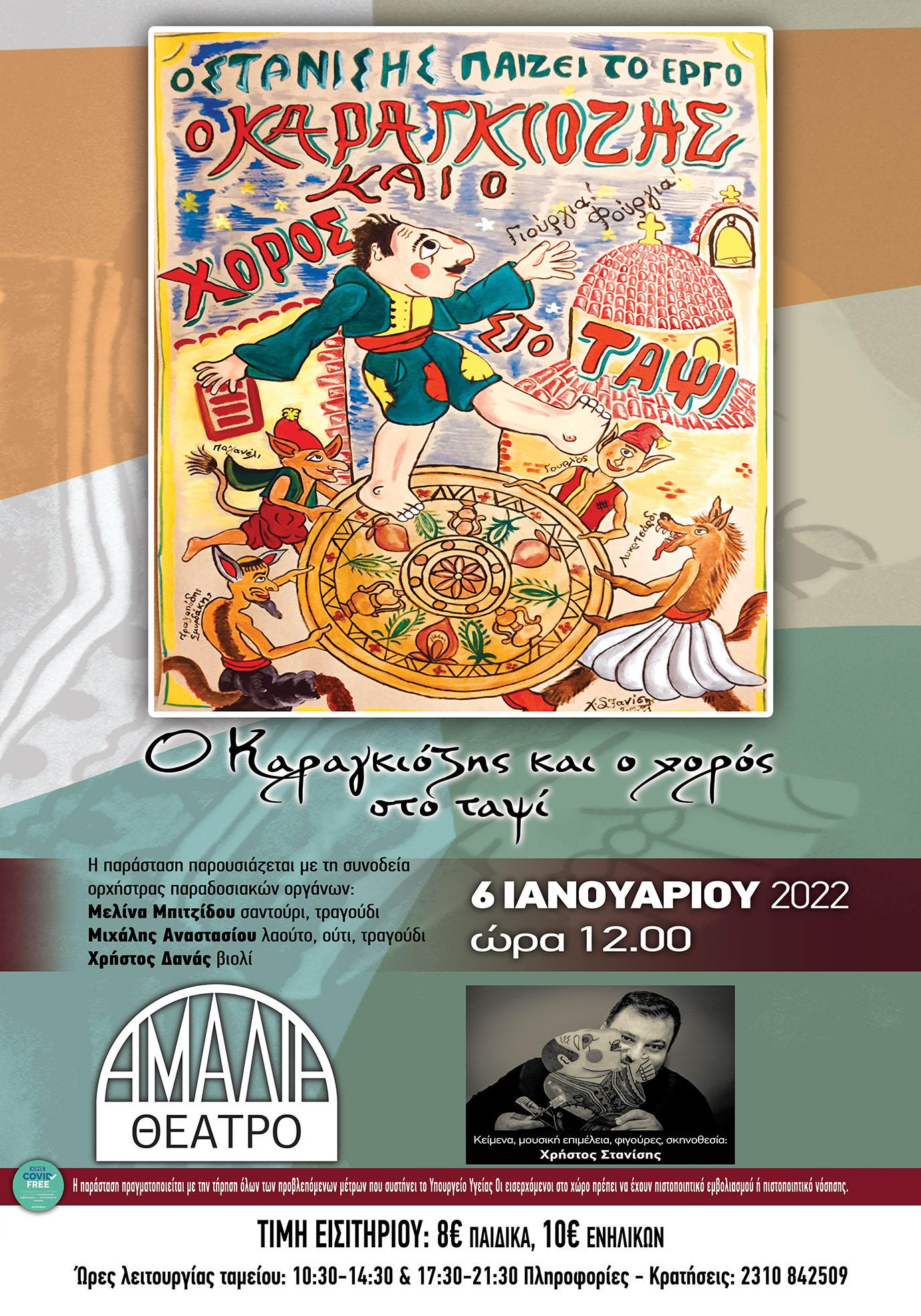 *«Ο Καραγκιόζης και ο χορός στο ταψί»» στο Θέατρο Αμαλία (Αμαλίας 71, Θεσσαλονίκη) |Πέμπτη 06 Ιανουαρίου 2022, ώρα 12.00 | Τιμές εισιτήριων: 10 ευρώ γενική είσοδος, 8 ευρώ παιδικό | Τα παιδιά από 14 ως 18 ετών μπορούν να εισέλθουν στο θέατρο με self test 24 ωρών. Οι ενήλικές με πιστοποιητικό εμβολιασμού ή νόσησης