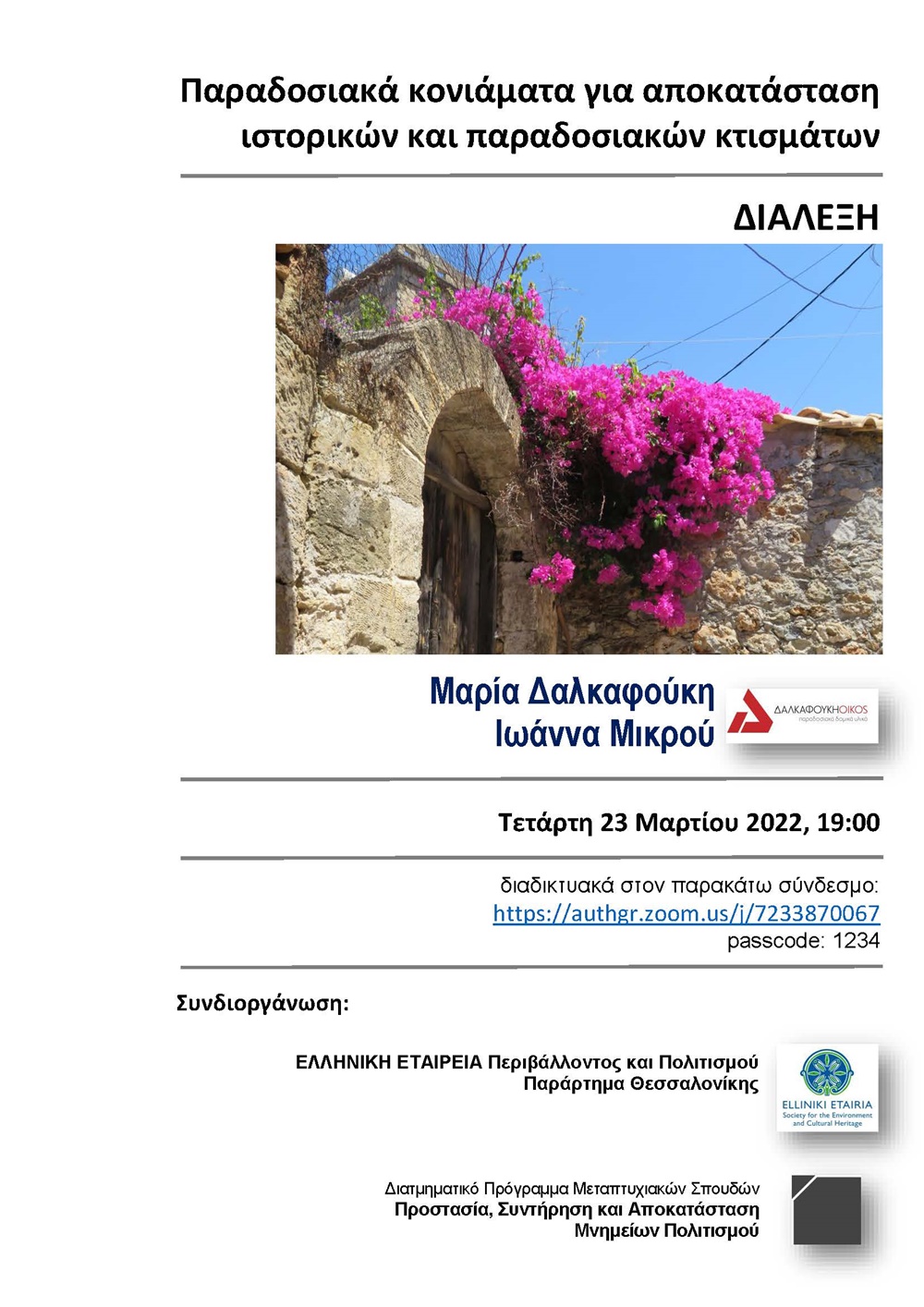 Την δεύτερη διάλεξη συνδιοργανώνουν το Παράρτημα της ΕΛΛΕΤ στην Θεσσαλονίκη και το Μεταπτυχιακό Πρόγραμμα Προστασία Συντήρηση και Αποκατάσταση Μνημείων, διαδικτυακά στον παρακάτω σύνδεσμο: