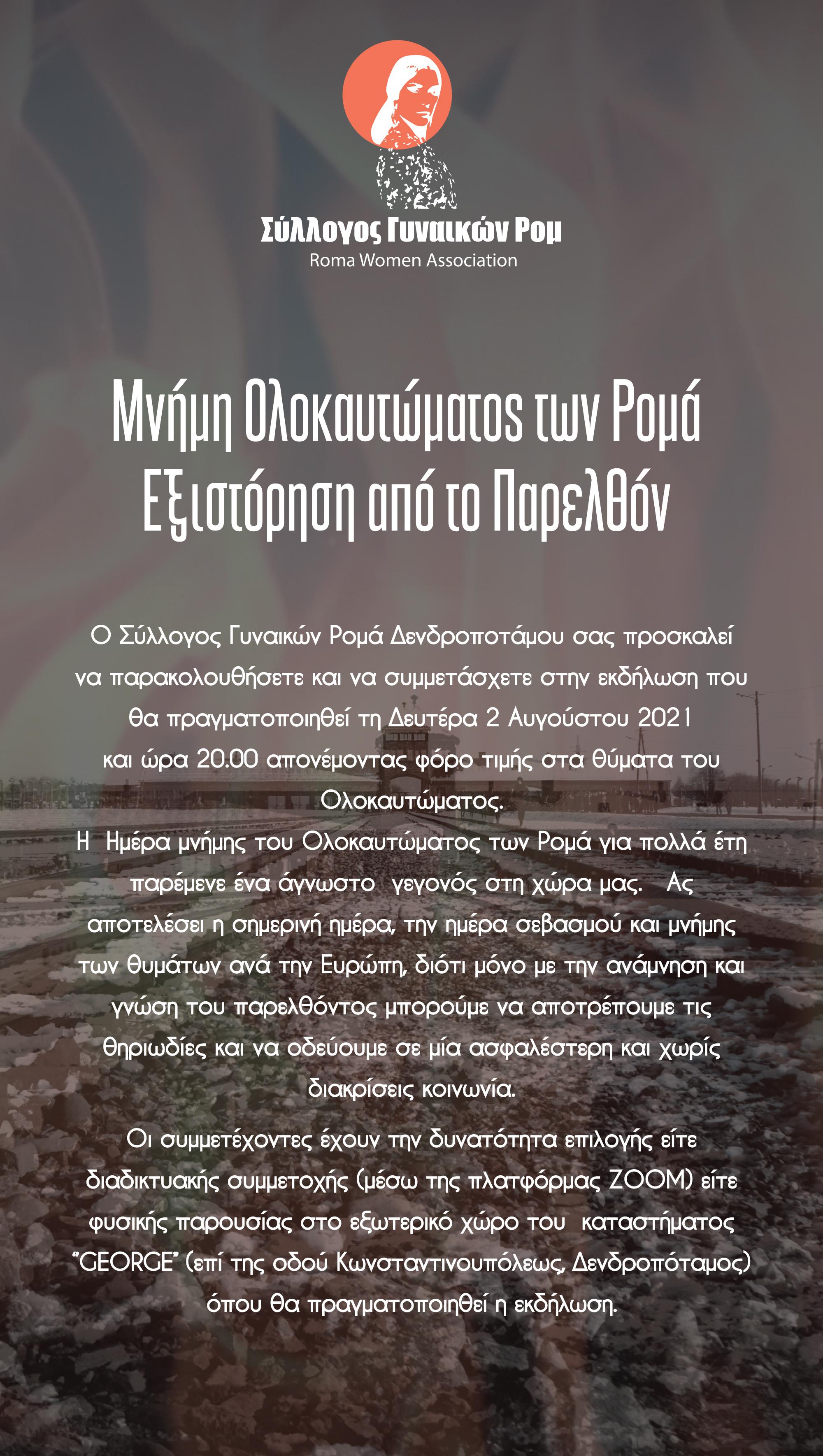 Ο Σύλλογος Γυναικών Ρομά Δενδροποτάμου θα πραγματοποιήσει εκδήλωση Μνήμη Ολοκαυτώματος των Ρομά, τη Δευτέρα 2 Αυγούστου 2021 και ώρα 20.00. Η εκδήλωση θα λάβει χώρα στο Δενδροπόταμο.