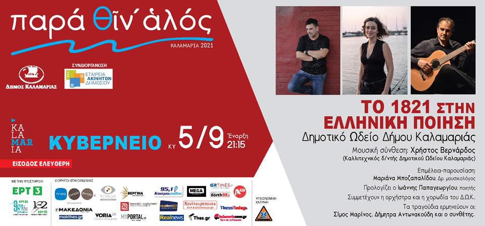 Στα πλαίσια του Παρά Θιν΄ Αλός 2021, το Δημοτικό Ωδείο Καλαμαριάς παρουσιάζει στον αύλειο χώρο του Κυβερνείου, την Κυριακή 5 Σεπτεμβρίου 2021, τη μουσική παράσταση: Το 1821 στην Ελληνική Ποίηση.