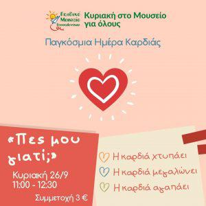 Το “Πες μου γιατί;” είναι μια δράση για παιδιά (ηλικίες 3-6) που ανακαλύπτουν τον κόσμο γύρω τους με περιέργεια, ενδιαφέρον και ενθουσιασμό! Με αφορμή την Παγκόσμια Ημέρα Καρδιάς, ανακαλύπτουμε την καρδιά σαν όργανο που μας δίνει ζωή, αλλά και όπου υπάρχει γύρω μας. Δημιουργούμε καρδιές που γεμίζουν χαρά, εμπνευσμένοι από διάσημα έργα τέχνης.