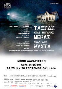 Την παραγωγή του ΚΘΒΕ «Ταξίδι μιας Μεγάλης Μέρας μέσα στη Νύχτα», θα έχουμε την ευκαιρία να απολαύσουμε το Σάββατο 25 και την Κυριακή 26 Σεπτεμβρίου 2021, στον εξωτερικό χώρο της Μονής Λαζαριστών, συμμετέχοντας στο Φεστιβάλ Μονής Λαζαριστών 2021-Open Air.