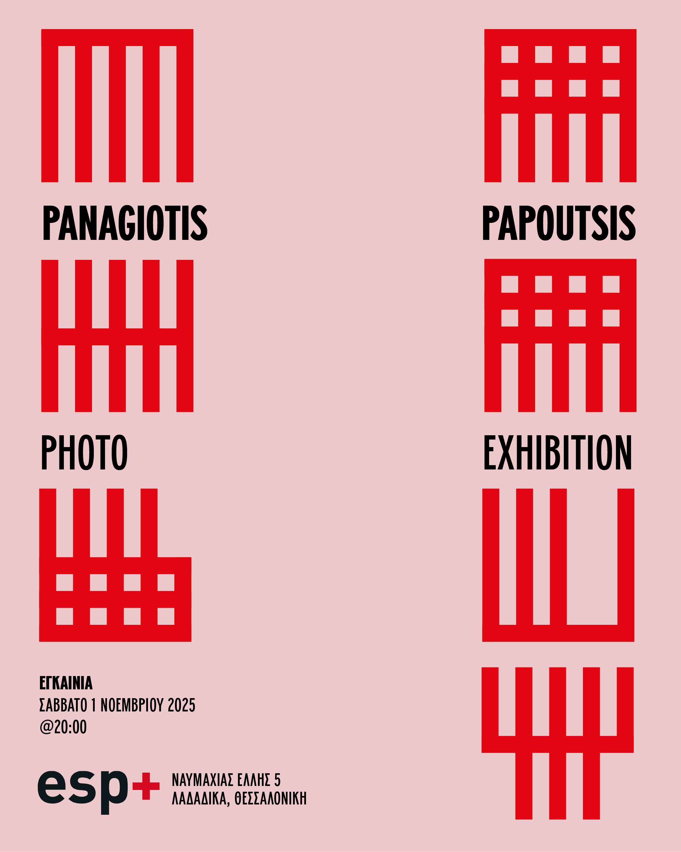 Εγκαίνια: Σάββατο 01.11.2025 / 20.00 Διάρκεια: 1.11.25–21.11.25 Ώρες λειτουργίας: Δευτέρα–Παρασκευή 10:00–18:00 esp+ gallery, Ναυμαχίας Έλλης 5, Λαδάδικα, Θεσσαλονίκη www.esp.gr | www.panagiotispapoutsis.gr