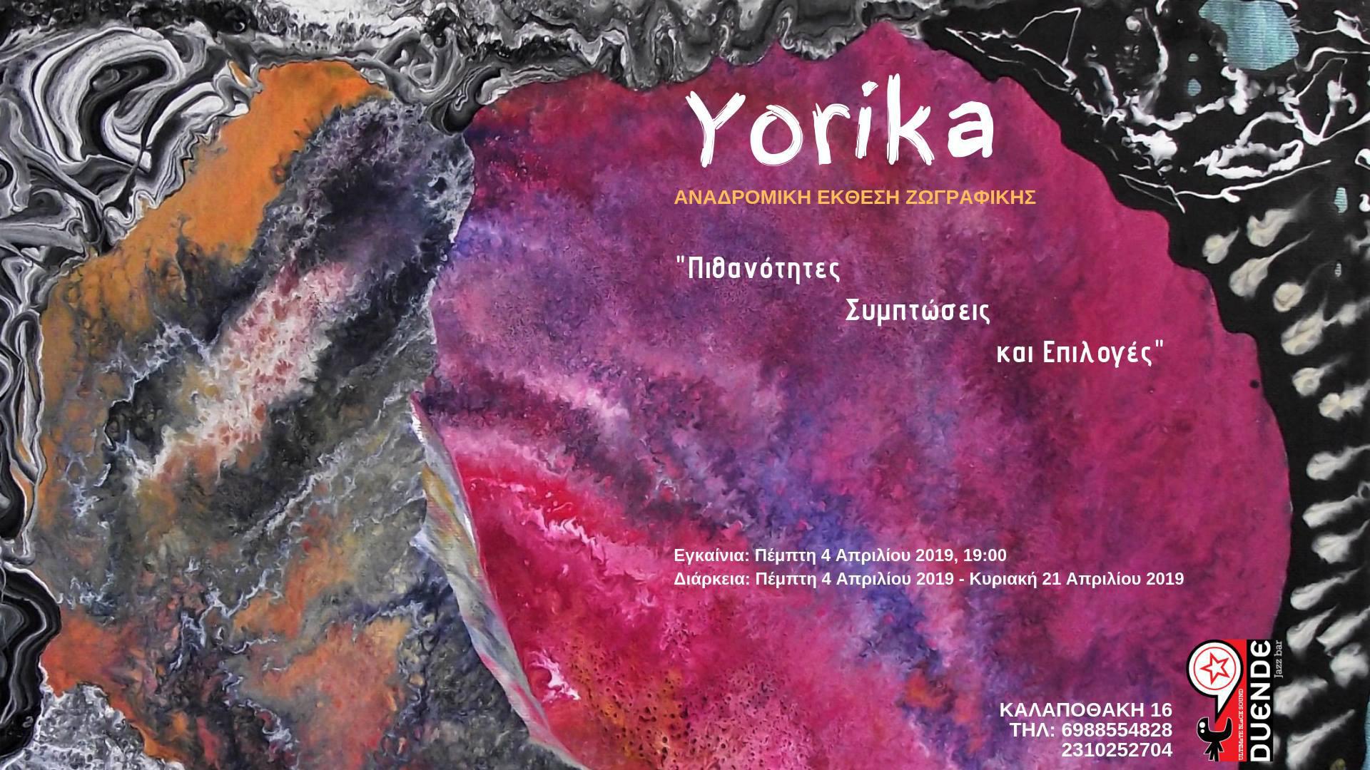 *Γιώργος Σεμερτζής aka Yorika, Αναδρομική Έκθεση Ζωγραφικής, ” Πιθανότητες, Συμπτώσεις και Επιλογές ” | Εγκαίνια: Πέμπτη 4 Απριλίου 2019, 19:00 | Διάρκεια: Πέμπτη 4 Απριλίου 2019 – Κυριακή 21 Απριλίου 2019, Duende Jazz Bar (Καλαποθάκη 16)