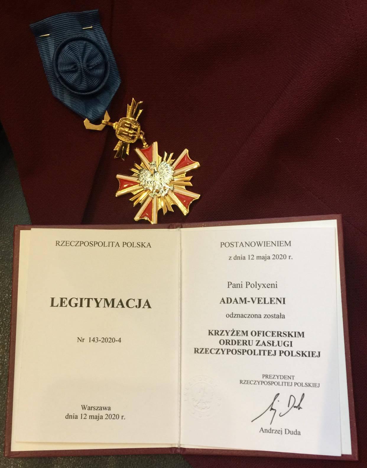 Σε μία σεμνή, λόγω covid-19, τελετή που φιλοξενήθηκε πριν λίγες ημέρες στην Πρεσβεία της Πολωνίας ο Πρέσβυς κ. Arthur Lompart απένειμε το μετάλλιο του Χρυσού Σταυρού του Ιππότη του Τάγματος της Αριστείας (Order of Merit) της Πολωνικής Δημοκρατίας στην κ. Πολυξένη Αδάμ-Βελένη, Προϊσταμένη της Γενικής Διεύθυνσης Αρχαιοτήτων και Πολιτιστικής Κληρονομιάς ως αναγνώριση της εξαιρετικής συμβολής της στην ανάπτυξη της πολωνο-ελληνικής συνεργασίας στον τομέα της αρχαιολογίας.