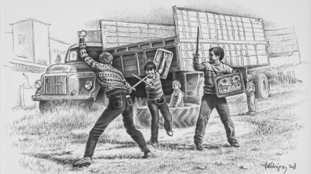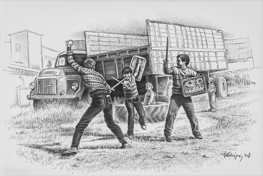Γιάννης Τσατσάγιας: Ένας αυτοδίδακτος καλλιτέχνης με πορεία που εμπνέει ανθρωπιά, αντοχή, επιμονή, κατάφαση ζωής. Ηθοποιός σε μπουλούκια, μανάβης, ποιητής, φιλόσοφος, περιπτεράς, μας γνωρίζει «το βάρος της Ελαφρότητας» με μόνο εφόδιο το «μαύρο μπικ», αναπτύσσοντας με αυτό μια δεξιοτεχνική τεχνοτροπία για να υποκαταστήσει τις πρακτικές δυσκολίες διάρκειας του κάρβουνου, όταν αποδίδει με “φωτογραφική” ακρίβεια θέματα που σχολιάζουν βιωματικά τον κόσμο του. Σαράντα χρόνια μετά, ένας προικισμένος νέος καλλιτέχνης από τη Δράμα, ο Γιώργος Ταξίδης, κερδίζει τον χώρο με το κάρβουνο που αναγκάστηκε να απορρίψει ο Τσατσάγιας, στην ίδια αισθητική καταγραφής αξιών και εσωτερικού θάλπους.