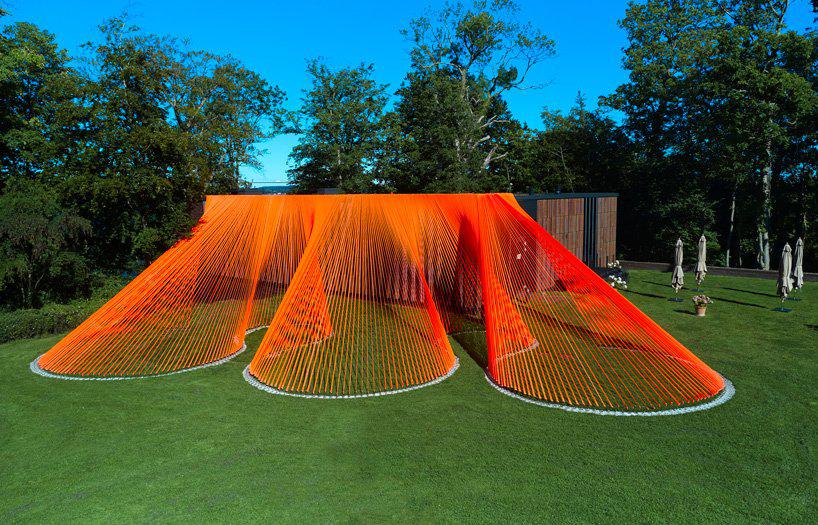 Tο “Τogether Αpart” του design studio Βehin Ηa περιλαμβάνει ένα ζευγάρι από φωτεινές πορτοκαλί, υφασμάτινες ίνες που κατασκευάστηκαν σε δύο διαφορετικές τοποθεσίες στη Δανία. Κάθε εγκατάσταση αποτελείται από περίπου 400 επικαλυμμένες κορδέλες τεντωμένες μεταξύ των οροφών των κτιρίων και του εδάφους. Τα δύο έργα αποτελούν συνέχεια της εγκατάστασης “Coshocton ray trace” του studio, τόσο σε μορφή όσο και σε λειτουργία, καθώς προσφέρονται επίσης ως χώροι για διάφορες παραστάσεις και συγκεντρώσεις.