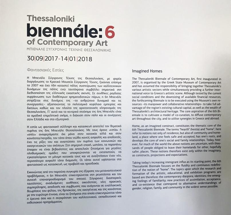Με έτος έναρξης το 2007, η Μπιενάλε Σύγχρονης Τέχνης Θεσσαλονίκης έχει ήδη φτάσει στην 6η της διοργάνωση, καταφέρνοντας να στρέψει το ενδιαφέρον του κόσμου στην εικαστική σκηνή της Ελλάδας και συμβάλλοντας στο να της δώσει διεθνή χαρακτήρα. Φέτος, επιστρέφει με ένα θέμα πλούσιο σε ερμηνείες, ορισμούς, συμβολισμούς, επίκαιρο όσο ποτέ λόγω της προσφυγικής κρίσης, αυτό της εστίας, με τίτλο «Ιmagined Homes / Φαντασιακές Εστίες». Εκκινώντας από την παρούσα συγκυρία της έξαρσης του μεταναστευτικού προβλήματος, επικεντρώνεται στη ρευστότητα και στον συνεχή επαναπροσδιορισμό του σπιτιού.
