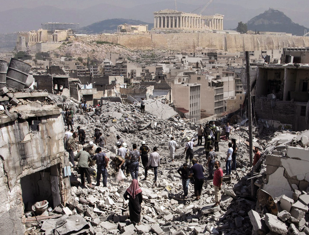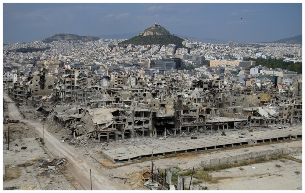 Οι οικοδομικοί όγκοι, έτσι όπως μπλέκονται μεταξύ τους, δημιουργούν μια εικόνα στην οποία διαφαίνονται τα κοινά χαρακτηριστικά των αστικών μεγαλουπόλεων. Με μια πολύ γρήγορη ματιά, ο θεατής μπορεί να μην καταλαβαίνει τι συμβαίνει, ειδικά αν εξαρχής εστιάσει σε σύμβολα γνώριμα στο μάτι, όπως ο Παρθενώνας και ο Λευκός Πύργος. Δευτερόλεπτα αργότερα, αντιλαμβάνεται κανείς την ασυμφωνία του συμβάντος με το χώρο, αλλά και την πιθανότητα να μπορούσε να έχει γίνει στο ίδιο σημείο το ακριβώς ίδιο συμβάν.