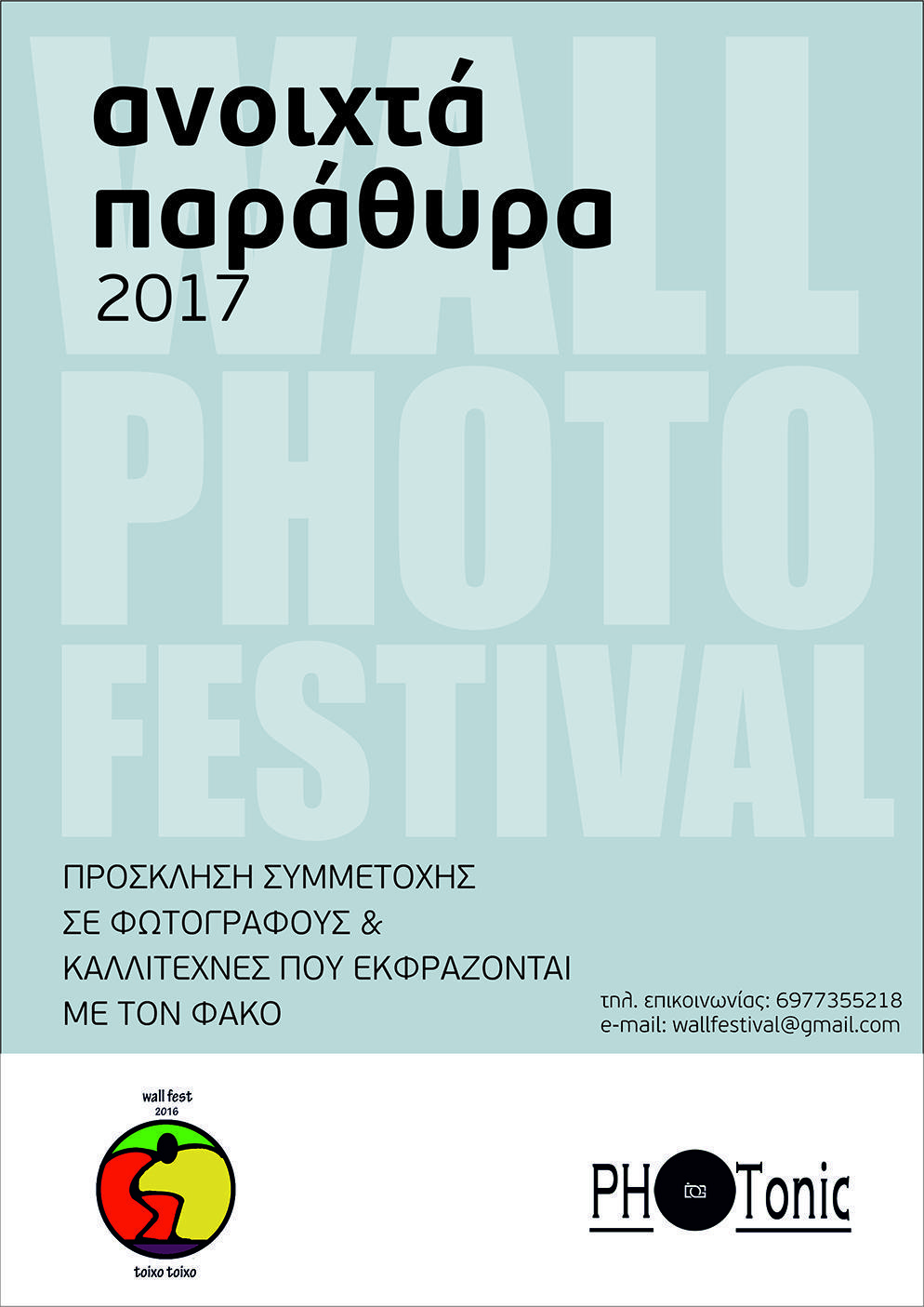 Στο πλαίσιο των δράσεων του Wall Festival, διοργανώνεται από την ομάδα PhoTonic έκθεση με θέμα «Ανοιχτά παράθυρα 2017». Προσκαλούνται φωτογράφοι και καλλιτέχνες που χρησιμοποιούν το φωτογραφικό μέσο να καταθέσουν τις δικές τους φωτογραφίες για τη δική τους συμμετοχή στην εν λόγω έκθεση, με καταληκτική ημερομηνία συμμετοχής μέχρι και 28 Αυγούστου 2017.