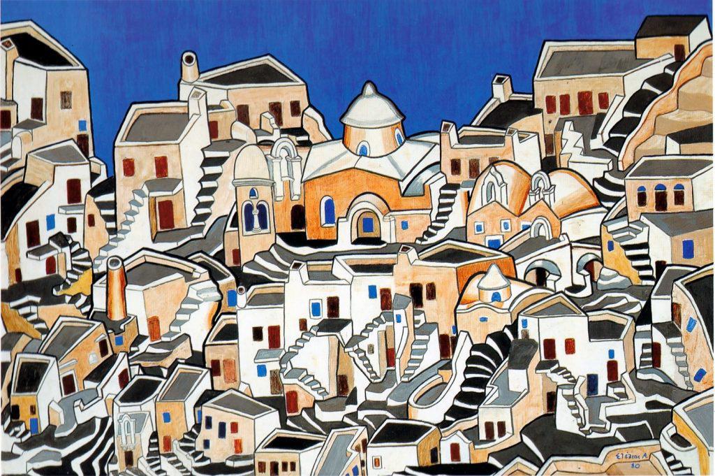 ΣΣ: Στέλιος Αναστασιάδης (1926-1995). Τοπίο Σκύρος 1980. Τέμπερα σε κόντρα-πλακέ 154Χ104 εκ. Ιδιωτική συλλογή