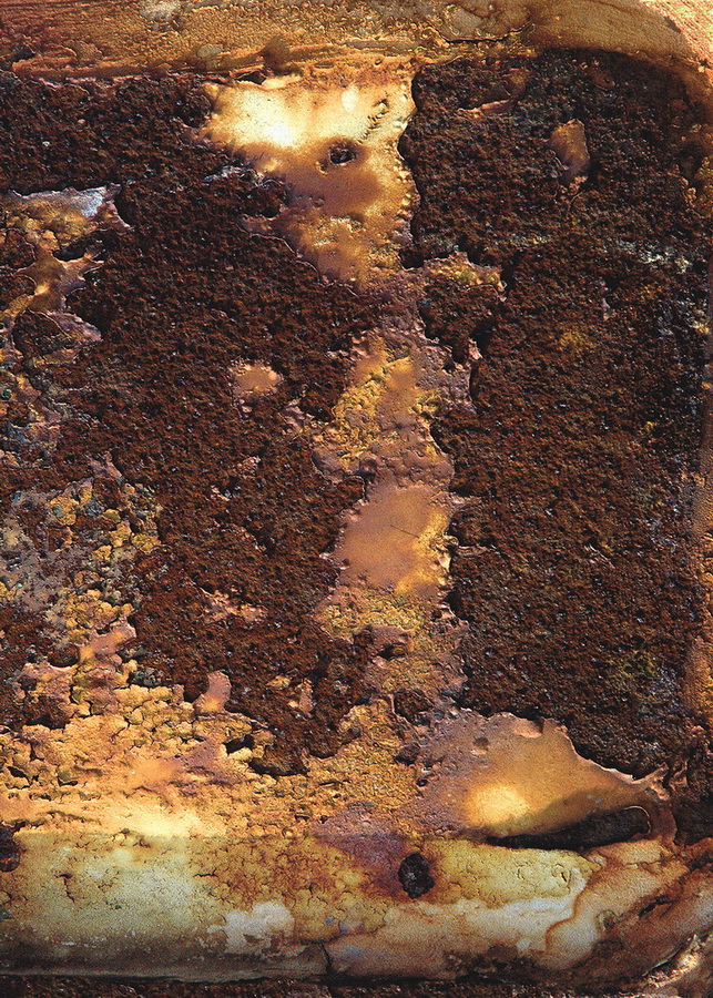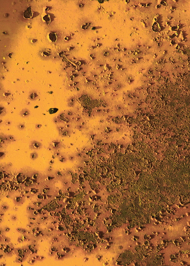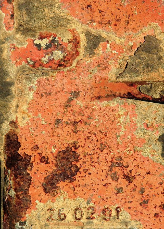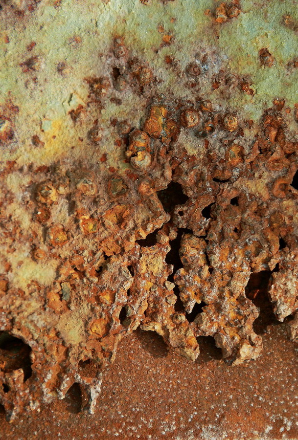 Η φωτογράφος έχει ιδιαίτερη αγάπη για το χρώμα της σκουριάς όπως αυτή απλώνεται στα αντικείμενα ως μια διαδικασία εν εξελίξει – και την αναδιανείμει μέσα από τα κοντινά της κάδρα, σε έργα που εύκολα παραπέμπουν σε αφηρημένους πίνακες ζωγραφικής.