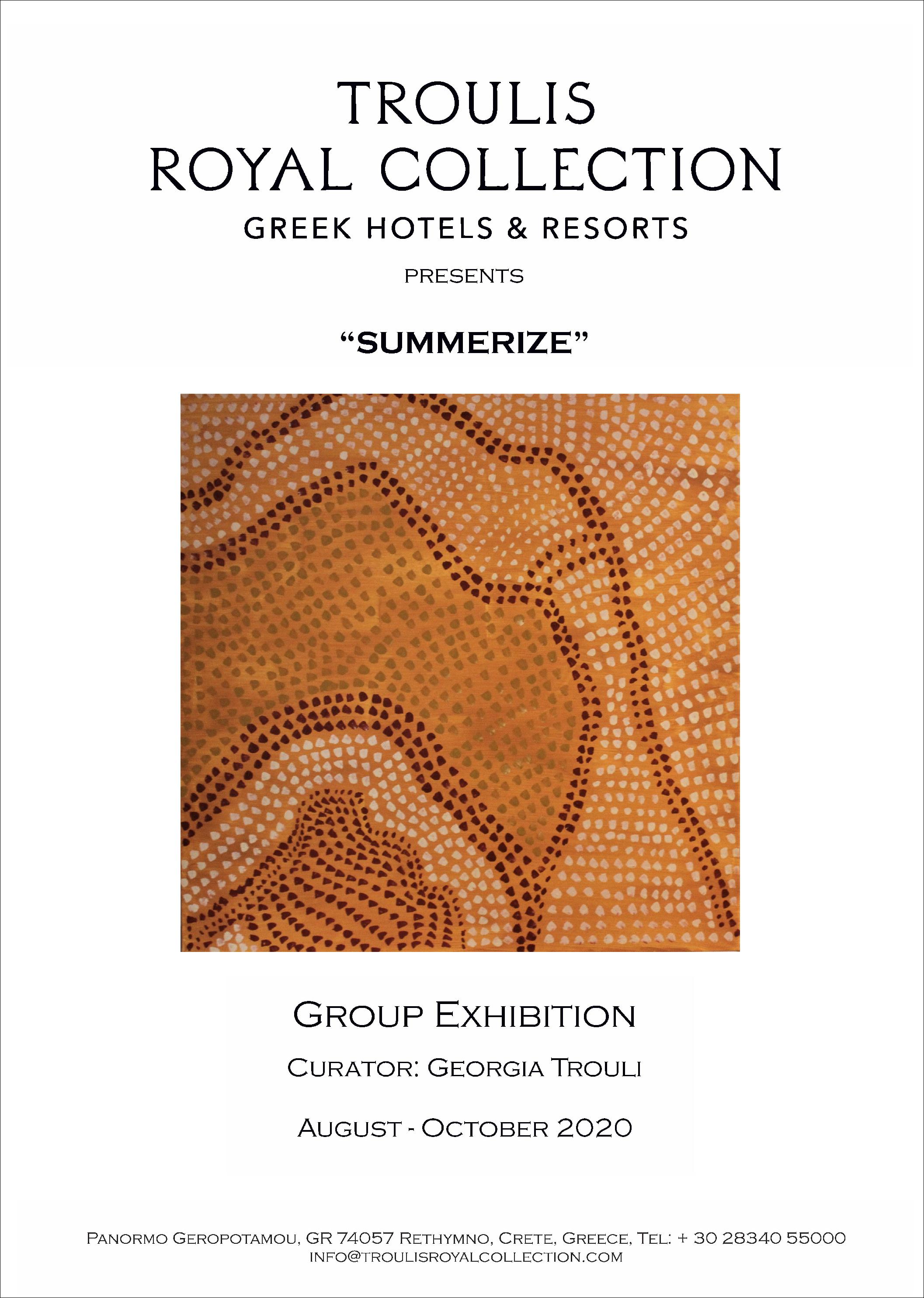 Έργα με ετερόκλητη αφετηρία στην δημιουργία τους και καλλιτέχνες από διαφορετικά μέρη της Ελλάδας ’συνοψίζονται’ στην έκθεση Summerize η οποία πραγματοποιείται το καλοκαίρι του 2020 στο ξενοδοχείο Royal Blue Resort & Spa στο Πάνορμο του Ρεθύμνου.