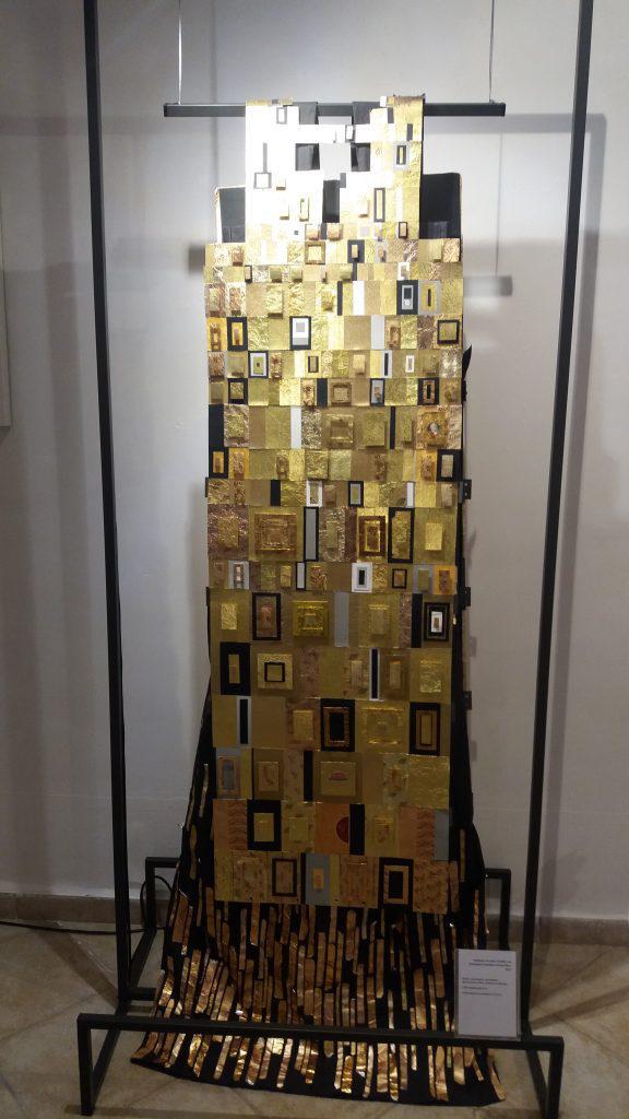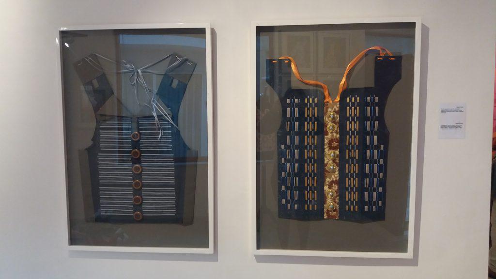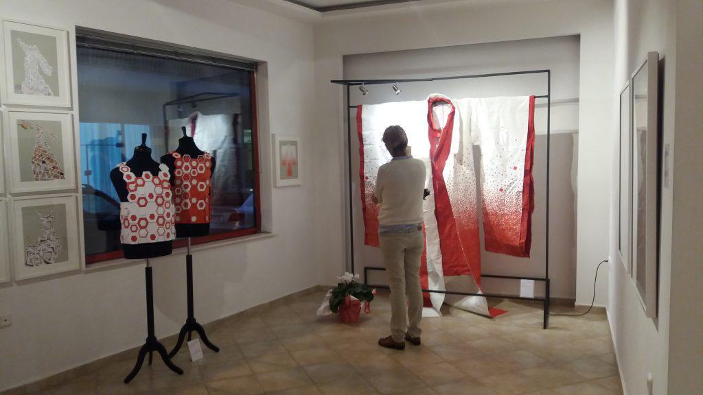 Μπαίνοντας στην έκθεση, βλέπεις κουστούμια μιας παράστασης. Η «παγίδα» στήθηκε αριστοτεχνικά. Πλησιάζοντας, κάτι υποψιάζεσαι. Άπειρα χαρτάκια, πολύ δουλειά, πολύ δύσκολο να φορεθούν. Τι συμβαίνει;