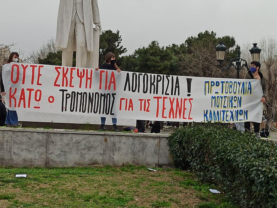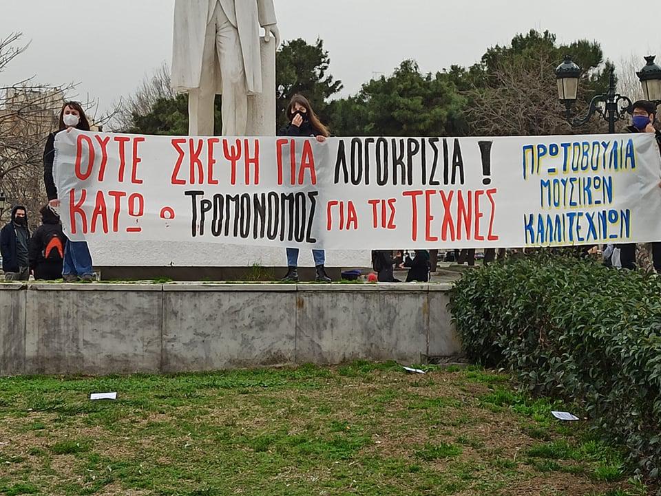Συγκέντρωση στο άγαλμα του Βενιζέλου στο κέντρο της Θεσσαλονίκης πραγματοποίησαν μέλη της Πρωτοβουλίας Μουσικών Καλλιτεχνών στέλνοντας ηχηρό μήνυμα κατά του «τρομονόμου» που προωθείται εις βάρος των τεχνών.
