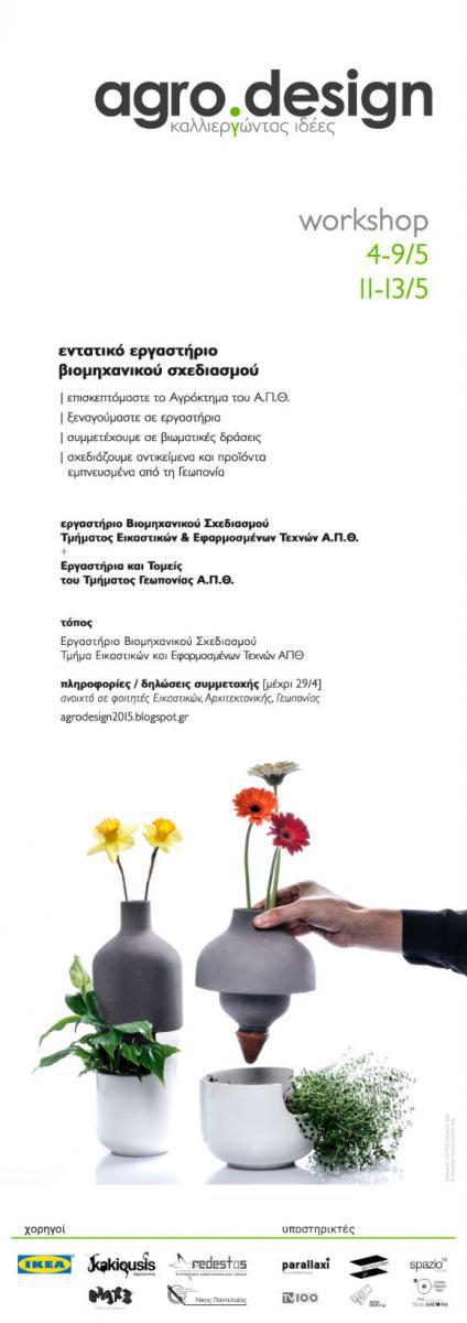 Σε ερωτήματα όπως τα παραπάνω θα επιχειρήσει να απαντήσει το agro.design workshop, η νέα πρωτοβουλία του εργαστηρίου Βιομηχανικού Σχεδιασμού του Τμήματος Εικαστικών και Εφαρμοσμένων Τεχνών Α.Π.Θ., σε συνεργασία με εργαστήρια του Τμήματος Γεωπονίας Α.Π.Θ. Μέσω αυτής της διεπιστημονικής σύμπραξης, φιλοδοξείται να εκκινηθεί μια ανοικτή διαδικασία βασικής έρευνας με σκοπό τον επαναπροσδιορισμό της σχέσης γεωπονίας και design.