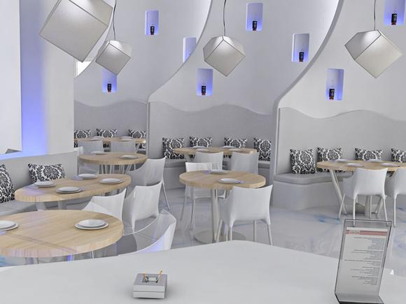 Bar-εστιατόριο: Εσωτερική διακόσμηση ενός κομψού και μοντέρνου χώρου εμπνευσμένο από τα νησιά των Κυκλάδων. Απλή, λιτή φόρμα και καθαρές γραμμές χαρακτηρίζουν τον χώρο, ενώ το λευκό και το μπλέ θυμίζουν Κυκλαδίτικη αρχιτεκτονική. Το εστιατόριο εκφράζεται από μία αίσθηση καθαριότητας και ηρεμίας, ιδανικό για να χαλαρώσετε απολαμβάνοντας ένα καλό γεύμα.