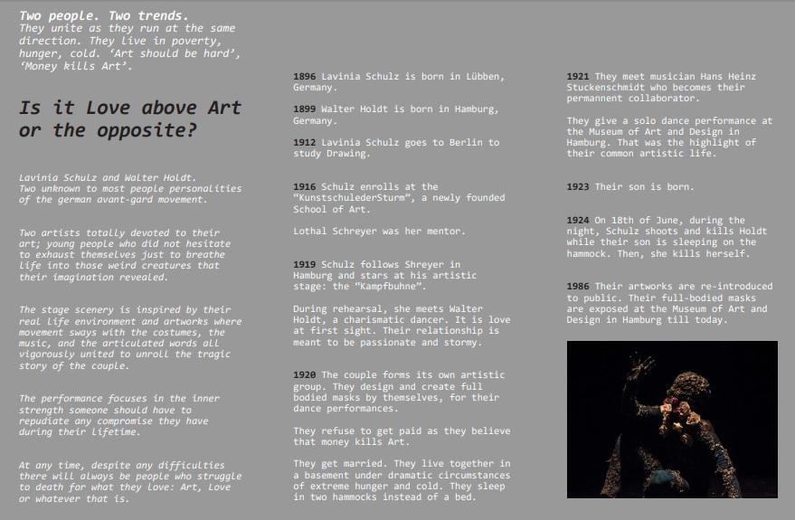 Η παράσταση βασίζεται σε βιογραφικά στοιχεία της ζωής και του έργου της Lavinia Schulz και του Walter Holdt, προβάλλοντας την άρνηση στον συμβιβασμό και τη ψυχική δύναμη του να μάχεσαι γι’ αυτό που αγαπάς.