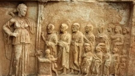 Πρόκειται για ένα αττικό μαρμάρινο αναθηματικό ανάγλυφο του δεύτερου μισού του 4ου αι. π.Χ., και πέντε χάλκινα ανθρωπόμορφα ειδώλια