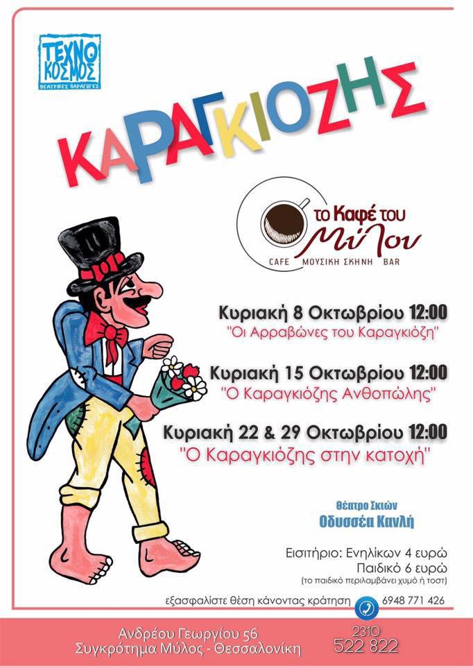*Κυριακή 29 Οκτωβρίου στις 12.00 στο Καφέ του Μύλου (Ανδρέα Γεωργίου 56). Εισιτήρια: Ενηλίκων 4 ευρώ, παιδικό 6 ευρώ (στο παιδικό συμπεριλαμβάνεται χυμός ή τοστ) Εξασφαλίστε θέσεις κάνοντας κράτηση εδώ: 2310522822, 6973958547