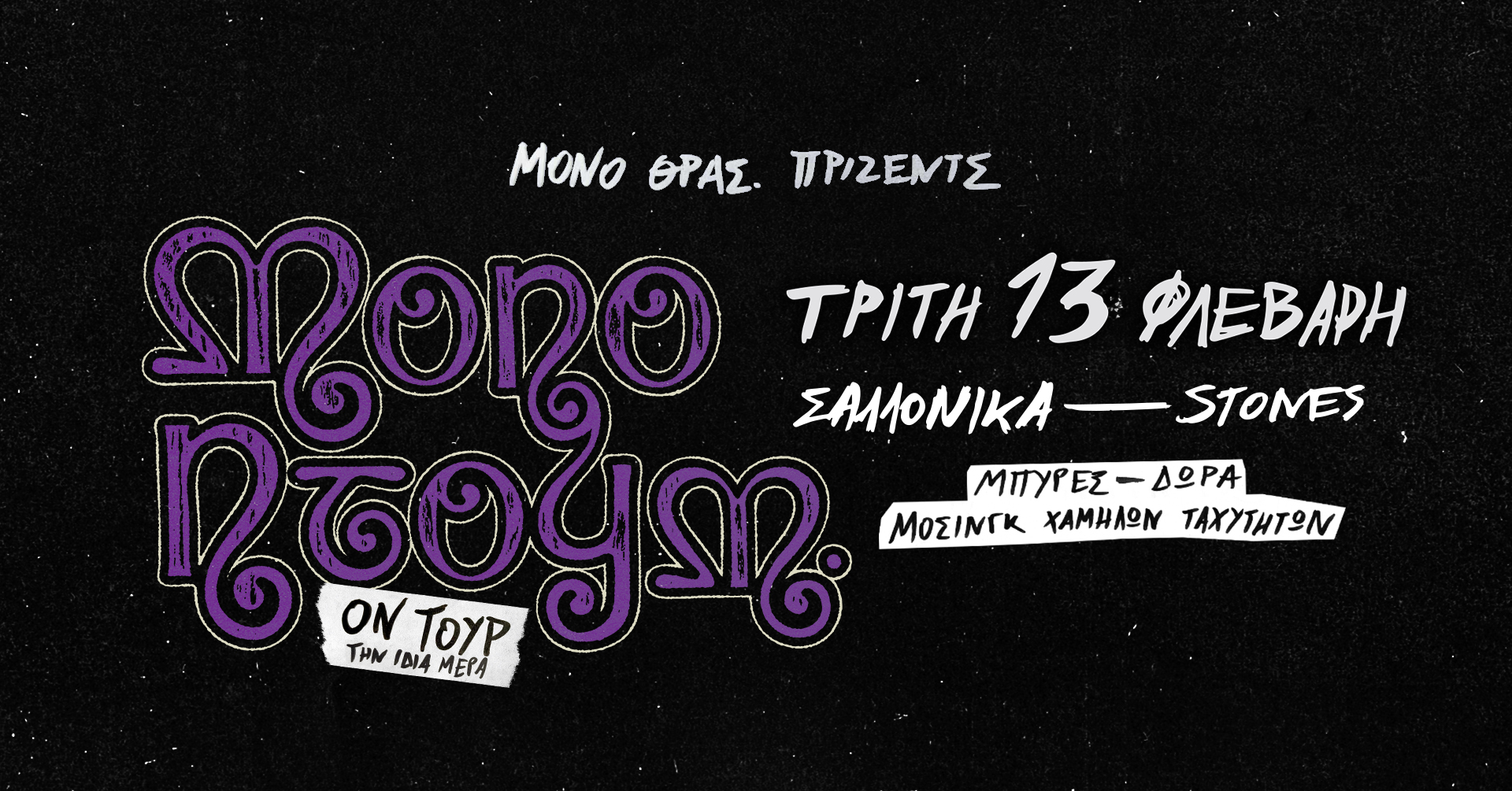 Κάποιος μεγάλος τύπος είχε πει κάποτε ότι αν αποσυνθέσεις το μέταλ στα βασικά του συστατικά, τι θα σου μείνει; Ο ήχος της βροχής, δύο κεραυνοί, λίγος αέρας και μια πένθιμη καμπάνα να χτυπά στο βάθος. Αυτή την Τρίτη 13 Φεβρουαρίου συγκεντρωνόμαστε να τιμήσουμε τον δίσκο που τα ξεκίνησε όλα. Το ομώνυμο των Black Sabbath, τον πιο αργό ΘΡΑΣ δίσκο που έχουμε ακούσει στη ζωή μας. Αυτά τα 38 λεπτά που βγάζουν στη σύνταξη όλα τα ρολόγια. Κανονίζουμε λοιπόν ένα ΜΕΓΚΑ ΜΟΝΟ ΝΤΟΥΜ ΤΟΥΡ σε 6 διαφορετικές πόλεις της Ελλάδας, στις πιο αγαπημένες μας χορευτικές πίστες, και γιορτάζουμε το βαρύτερο αργο-παιγμένο αγγλικό ροκ, χτυπώντας μπύρες στη μπάρα και δοξάζοντας τον σκοτεινό Κύριο. Με την ευκαιρία ενημερώνουμε και για το υπερβολικά λίμιτεντ επανατύπωμα της ΜΟΝΟ ΝΤΟΥΜ φανέλας με την κλασσική γραμματοσειρά του πρώτου Σάμπαθ.