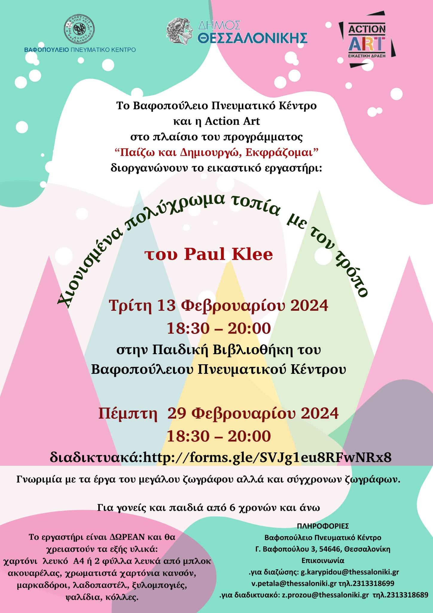 Ένα εικαστικό εργαστήρι με τους καλλιτέχνες και παιδαγωγούς της Αction Art www.action-art.gr Για γονείς και παιδιά από 6 χρονών και άνω. Γνωρίζουμε τα έργα του μεγάλου ζωγράφου αλλά και σύγχρονων ζωγράφων. Παίζοντας με τις υφές των χρωμάτων και των χαρτονιών, δημιουργούμε εμπνεόμενοι από τα έργα τους τα δικά μας έργα, ζωγραφισμένα με το εκτυφλωτικό φως του χιονιού, τα πολύχρωμα βουνά με τις ολόλευκες κορυφές, τα δένδρα με τα γυμνά κλαδιά και τις πολύχρωμες νιφάδες. Υλικά που χρειάζονται: 1 χαρτόνι λευκό Α4 ή 2 φύλλα λευκά από μπλοκ ακουαρέλας, χρωματιστά χαρτόνια κανσόν, μαρκαδόροι, λαδοπαστέλ, ξυλομπογιές, ψαλίδια, κόλλες