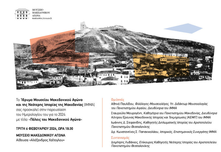 Το Ίδρυμα του Μουσείου Μακεδονικού Αγώνα και της Νεότερης Ιστορίας της Μακεδονίας (ΙΜΜΑ) σας προσκαλεί στην παρουσίαση του Ημερολογίου του ΙΜΜΑ για το 2024 με τίτλο «Πόλεις του Μακεδονικού Αγώνα», την Τρίτη 6 Φεβρουαρίου και ώρα 6:30 μ.μ., στην αίθουσα «Αλέξανδρος Χαΐτογλου» του Μουσείου Μακεδονικού Αγώνα.