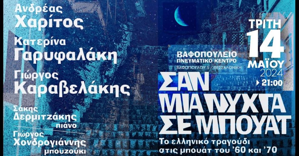 Η Κατερίνα Γαρυφαλάκη, ο Ανδρέας Χαρίτος και ο Γιώργος Καραβελάκης με τις κιθάρες τους, πλαισιωμένοι από τους μουσικούς Σάκη Δερμιτζάκη στο πιάνο και Γιώργο Χονδρογιάννη στο μπουζούκι, αναβιώνουν στη σκηνή του Βαφοπούλειου το κλίμα των μπουάτ των δεκαετιών ‘60 και ‘70. Έχοντας επιλέξει τα πιο αγαπημένα τραγούδια από τους δημιουργούς και τους ερμηνευτές της εποχής του Νέου Κύματος και του καλού ελληνικού λαϊκού τραγουδιού, φιλοδοξούν να μετατρέψουν τη μικρή συναυλιακή αίθουσα σε έναν χώρο μυσταγωγικής ένωσης φωνών και ψυχών, με ατμόσφαιρα παλιάς μπουάτ, όπου καλλιτέχνες και κοινό αναζητούσαν τον “πυρήνα” του καλού τραγουδιού, χωρίς απόσταση μεταξύ τους. Εκεί θα θυμηθούμε τα τραγούδια που συντρόφευσαν τις χαρές και τις λύπες μας, τις αγωνίες και τις αγάπες μας, κυρίως όμως, τα όνειρά μας. Μεγάλοι δημιουργοί όπως ο Γ. Σπανός, ο Μ. Πλέσσας, ο Μ. Λοΐζος, ο Δ. Μούτσης, ο Μ. Χατζιδάκις, ο Κ. Χατζής, ο Δ. Σαββόπουλος κ.α., με στίχους των Λ. Παπαδόπουλου, Οδ. Ελύτη, Άκου Δασκαλόπουλου, Σώτιας Τσώτου, Ν. Γκάτσου κ.α, και εξαιρετικούς ερμηνευτές τον Μ. Βιολάρη, Κ. Χωματά, Π. Αστεριάδη, Γ. Ζωγράφο, Λάκη Παππά, Γ. Πουλόπουλο, Ρ. Κουμιώτη, Μ. Μητσιά κ.α., άφησαν εποχή με τραγούδια ανεπανάληπτα, που αξίζει να θυμόμαστε πάντα! Αυτές θα είναι οι επιλογές μας σε αυτήν τη μοναδική βραδιά που θέλουμε να μοιραστούμε μαζί σας. Τρίτη 14 Μαΐου 2024 | Έναρξη προσέλευσης: 8μμ | Έναρξη παράστασης: 9μμ (Δεν υπάρχει αρίθμηση θέσεων) | Εισιτήριο εισόδου: 15€