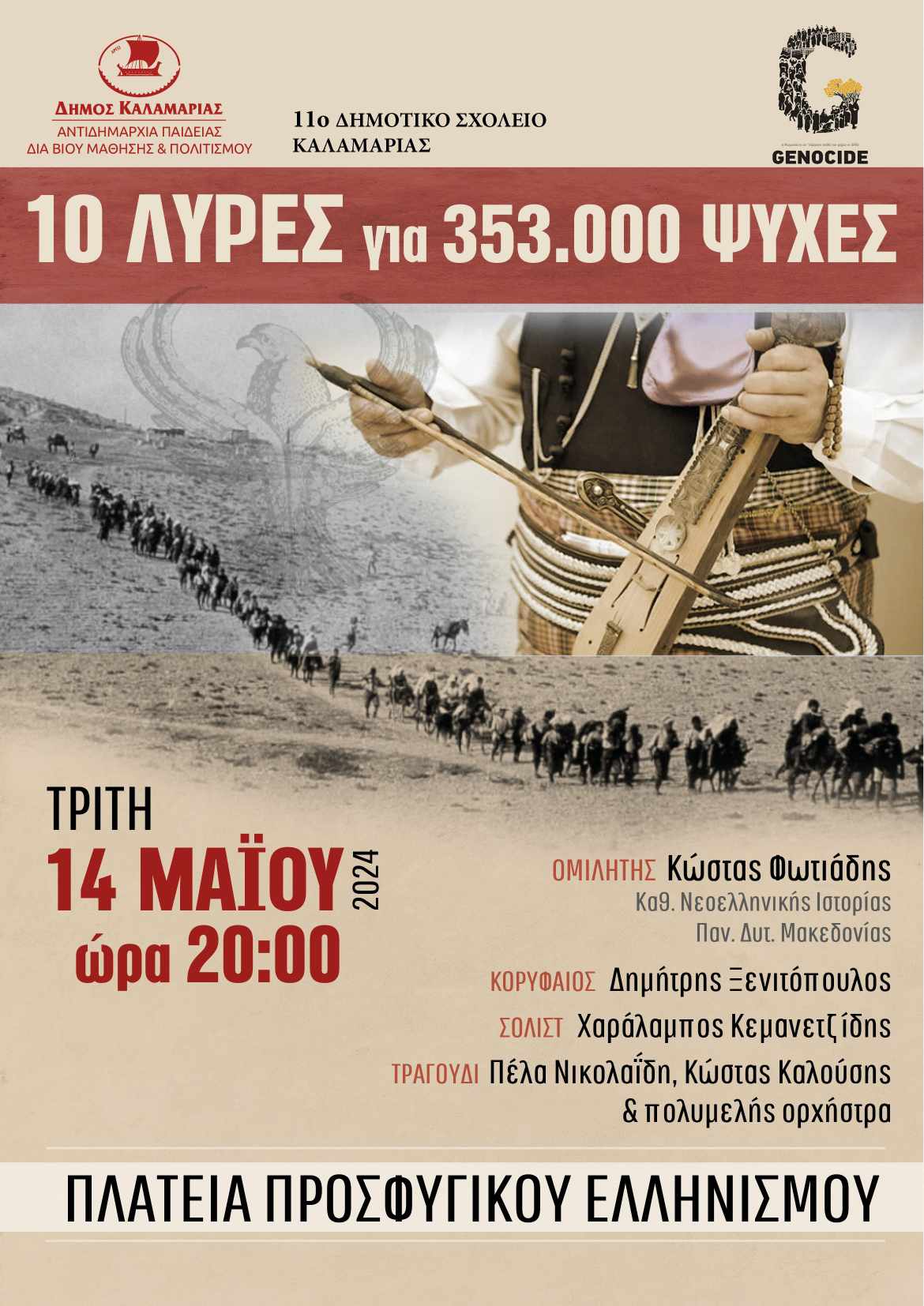Η Αντιδημαρχία Παιδείας Δια Βίου Μάθησης και Πολιτισμού Δήμου Καλαμαριάς σε συνεργασία με το 11ο Δημοτικό Σχολείο Καλαμαριάς προγραμμάτισαν και θα παρουσιάσουν μια εκδήλωση γεμάτη συναισθήματα, ιστορικές μνήμες και μαρτυρίες. Στην επιστημονική τεκμηρίωση της Γενοκτονίας και του Εθνικού ξεριζωμού θα συμβάλει με την αδιαμφισβήτητη γνώση και ευαισθησία του ο καθηγητής Ιστορίας, κύριος Κωνσταντίνος Φωτιάδης, ενώ ένα μουσικό σχήμα στο οποίο θα συμμετέχουν 10 λύρες θα αναδείξει τον μουσικό πολιτισμό της πατρώας Ποντιακής γης» επισημαίνει ο Αντιδήμαρχος Παιδείας, Δια Βίου Μάθησης και Πολιτισμού, Θάνος Γιαννακός.