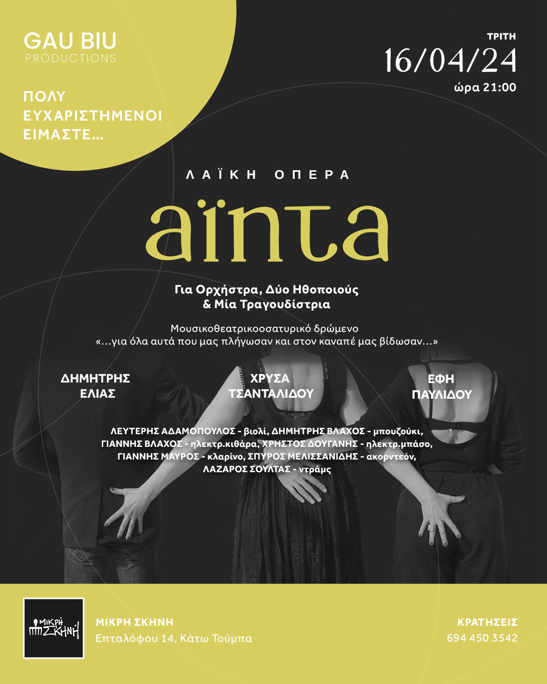 Ένα μουσικοθεατρικοσατυρικό δρώμενο για ορχήστρα, δύο ηθοποιούς και μία τραγουδίστρια από τους GAU BIU PRODUCTIONS την Τρίτη 16 Απριλίου στις 21:00, για δεύτερη φορά στην Μικρή Σκηνή.
