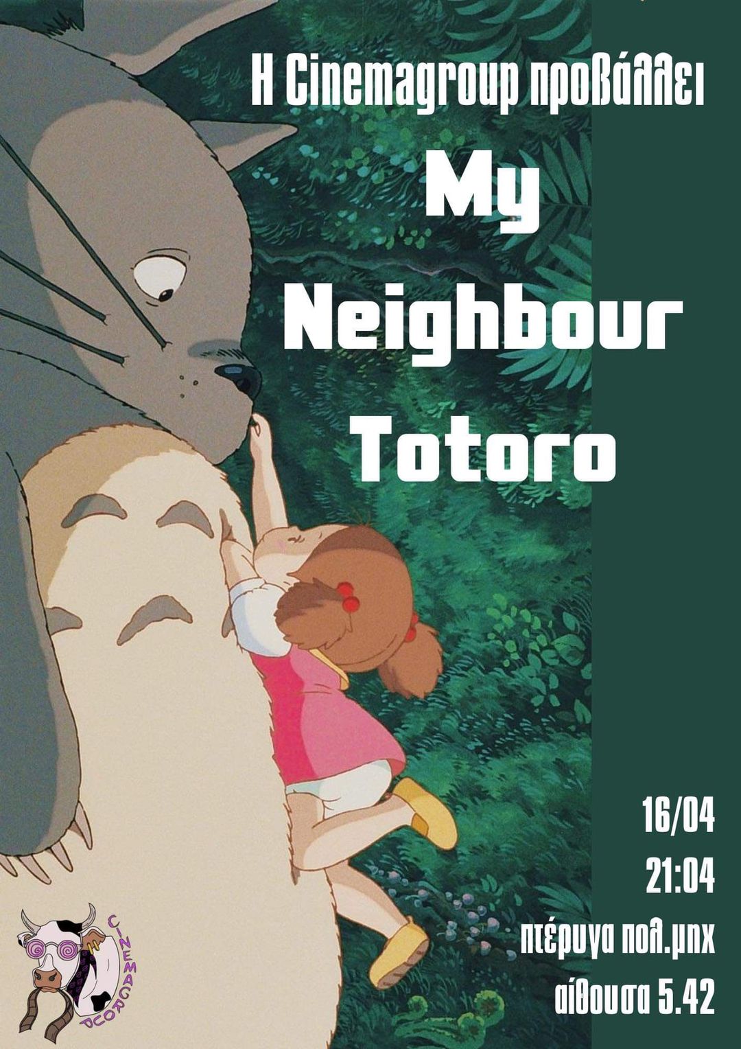 Η cinemagroup αυτή την τρίτη προβάλλει την ταινία… My Neighbour Totoro. Δύο αδερφές μετακομίζουν στη χώρα με τον πατέρα τους για να έρθουν πιο κοντά στη νοσηλευόμενη μητέρα τους και ανακαλύπτουν ότι τα γύρω δέντρα κατοικούνται από Τοτόρο, μαγικά πνεύματα του δάσους. Όταν ο μικρότερος φεύγει από το σπίτι, η μεγαλύτερη αδερφή ζητά βοήθεια από τα πνεύματα για να τη βρει. Ραντεβού την τρίτη 16/04 στις 21:04 | Πολυτεχνική σχολή ΑΠΘ, 2η πτέρυγα, αίθουσα 5.42