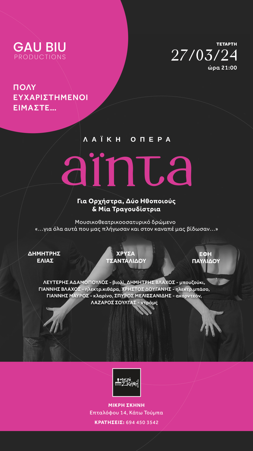 Μουσικοθεατρικοσατυρικό δρώμενο Για Ορχήστρα, Δύο Ηθοποιούς & Μία Τραγουδίστρια Η ομάδα GAU BIU PRODUCTIONS (Γκάου Μπίου Προντάκτιονς) ξαναχτυπά ! Μια επιχείρηση αντίστασης με όπλα τη μουσική και τη σάτιρα που καταλήγει στο ηρωϊκό επιφώνημα ΆΪΝΤΑΑΑΑ «που άλλοτε σημαίνει βουρ και γιούρια και άλλοτε ξέσπασμα χαράς στο λάκο με τ’αγγούρια» ! Η Λαϊκή Όπερα «ΆΪΝΤΑ» παρουσιάζεται με μεγάλη επιτυχία από το 2019 έως σήμερα σε διάφορους χώρους της πόλης (ΞΕΦΩΤΟ, METROPOLITAN URBAN THEATRE, EIGHTBALL). Με εναλλασόμενο ρεπερτόριο σε κείμενα και μουσικές, η ομάδα επιμένει και επανέρχεται δυναμικά για να επικοινωνήσει τους νταλγκάδες της με άλλους πληγωμένους και υποψιασμένους συμπολίτες !