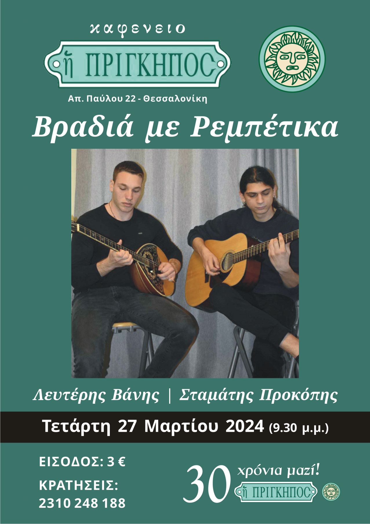 Ρεμπέτικη βραδιά στον Πρίγκηπο με τον Λευτέρη Βάνη και τον Σταμάτη Προκόπη.