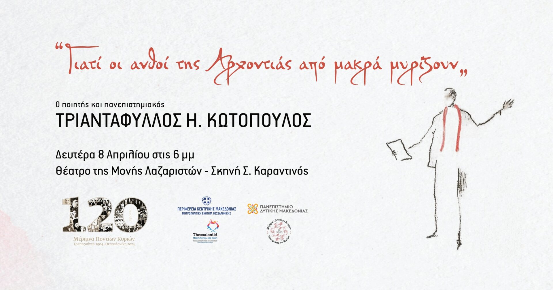 Το ιστορικό Σωματείο της Μέριμνας Ποντίων Κυριών στα πλαίσια του εορτασμού για τα 120 χρόνια από την ίδρυσή του, πραγματοποιεί τιμητική εκδήλωση για τον Ακαδημαϊκό Καθηγητή και ποιητή κ. Τριαντάφυλλο Η. Κωτόπουλο.