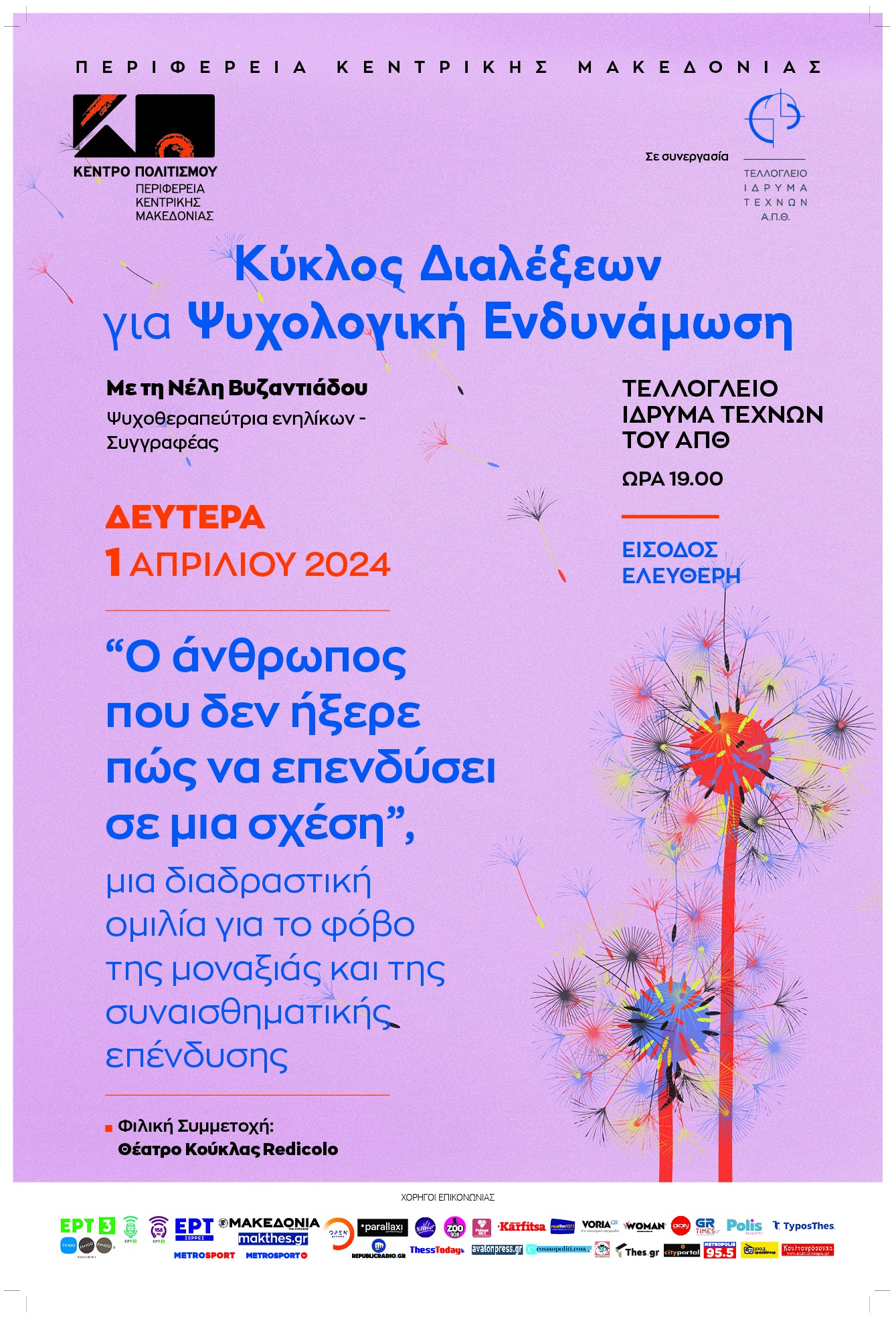 Το Κέντρο Πολιτισμού της Περιφέρειας Κεντρικής Μακεδονίας ολοκληρώνει τον 2ο «Κύκλο διαλέξεων για Ψυχολογική Ενδυνάμωση» με την Νέλη Βυζαντιάδου – ψυχοθεραπεύτρια ενηλίκων , συγγραφέα και με την φιλική συμμετοχή ανθρώπων των γραμμάτων και τεχνών.
