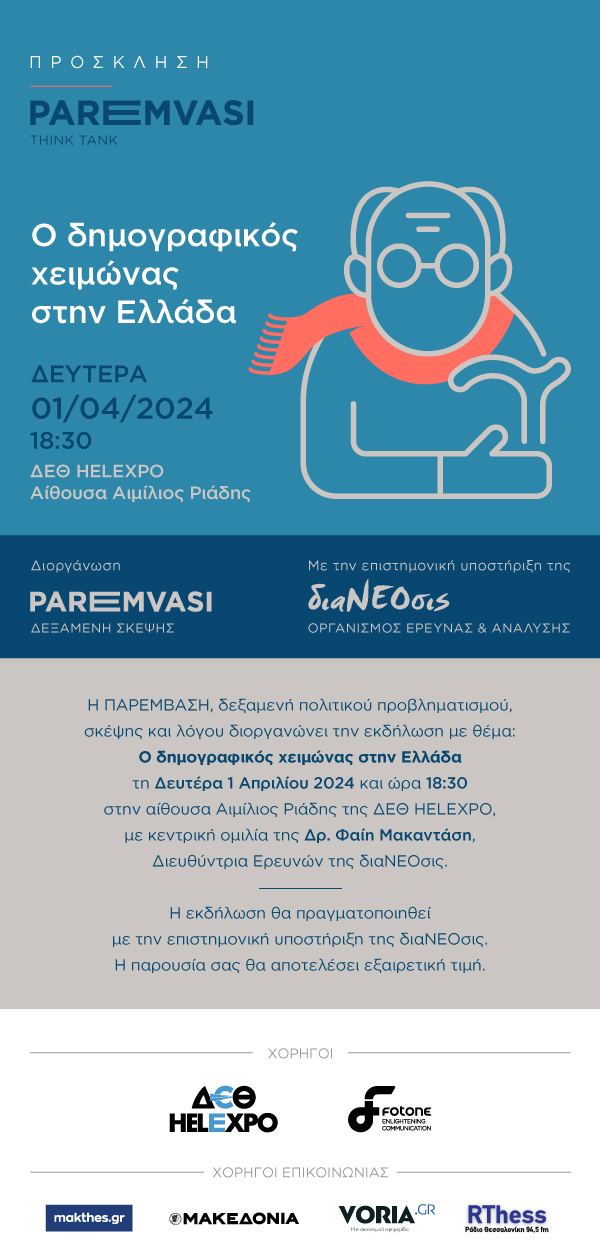 Η ΠΑΡΕΜΒΑΣΗ, δεξαμενή πολιτικού προβληματισμού, σκέψης και λόγου διοργανώνει την εκδήλωση µε θέμα: «Ο δημογραφικός χειμώνας στην Ελλάδα» τη ∆ευτέρα 1 Απριλίου 2024 και ώρα 18:30 στην αίθουσα Αιµίλιος Ριάδης της ∆ΕΘ HELEXPO, µε κεντρική ομιλία της ∆ρ. Φαίη Μακαντάση, Διευθύντρια Ερευνών της διαΝΕΟσις.