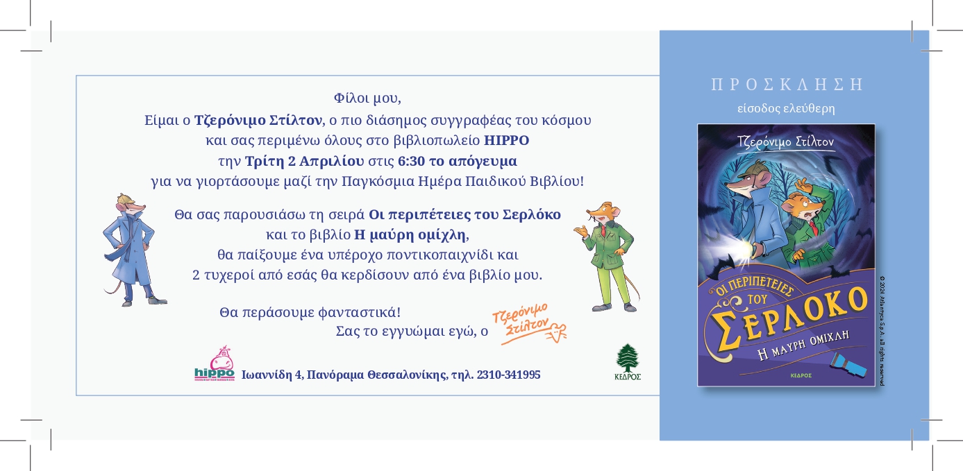 Είμαι ο Τζερόνιμο Στίλτον, ο πιο διάσημος συγγραφέας του κόσμου και σας περιμένω όλους στο βιβλιοπωλείο Hippo την Τρίτη 2 Απριλίου στις 6:30 το απόγευμα για να γιορτάσουμε μαζί την Παγκόσμια Ημέρα Παιδικού Βιβλίου! Θα σας παρουσιάσω τη σειρά Οι περιπέτειες του Σερλόκο και το βιβλίο Η μαύρη Ομίχλη, θα παίξουμε ένα υπέροχο ποντικοπαιχνίδι και 2 τυχεροί θα κερδίσουν από ένα βιβλίο μου. Θα περάσουμε φανταστικά! Σας το εγγυώμαι εγώ, Ο Τζερόνιμο Στίλτον.