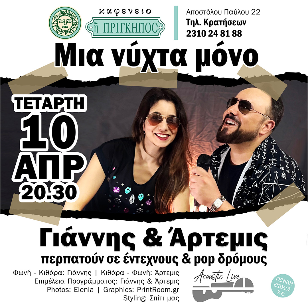 Τετάρτη 10 Απριλίου 2024 στις 20:30 Μια Νύχτα μόνο acoustic live; με τον Γιάννη και την Άρτεμη να περπατούν σε έντεχνους και ποπ δρόμους. Είσοδος 3 ευρώ Κρατήσεις 2310248188