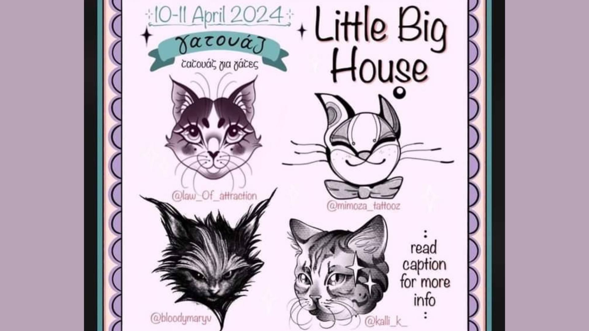 Για δύο μέρες, την Τετάρτη 10 και την Πέμπτη 11 Απριλίου 2024 και ώρες από τις 12:00 μέχρι τις 20:00, τέσσερις εξαιρετικές tattoo καλλιτέχνισες της πόλης μας , φίλες και γατοφίλες ενώνουν τις δημιουργικές τους δυνάμεις στο Little Big House Café με σκοπό να προσφέρουν τον κόπο τους και την τέχνη τους στην υπηρεσία των λατρεμένων μας, χνουδωτών τετράποδων, ενισχύοντας με μέρος των εσόδων τους το εγχείρημα συλλογής χρημάτων για τις ανάγκες τροφής, στειρώσεων και ιατρικής περίθαλψης των Little Big House γατών μας.