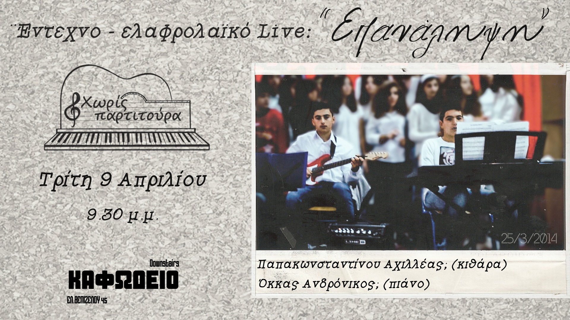 Μουσική βραδιά με αγαπημένα έντεχνα και ελαφρολαϊκά τραγούδια. Παπακωνσταντίνου Αχιλλέας (κιθάρα – φωνή) Όκκας Ανδρόνικος (πιάνο – φωνή) ΄Εναρξη : 9.30 μ.μ. Είσοδος ελεύθερη