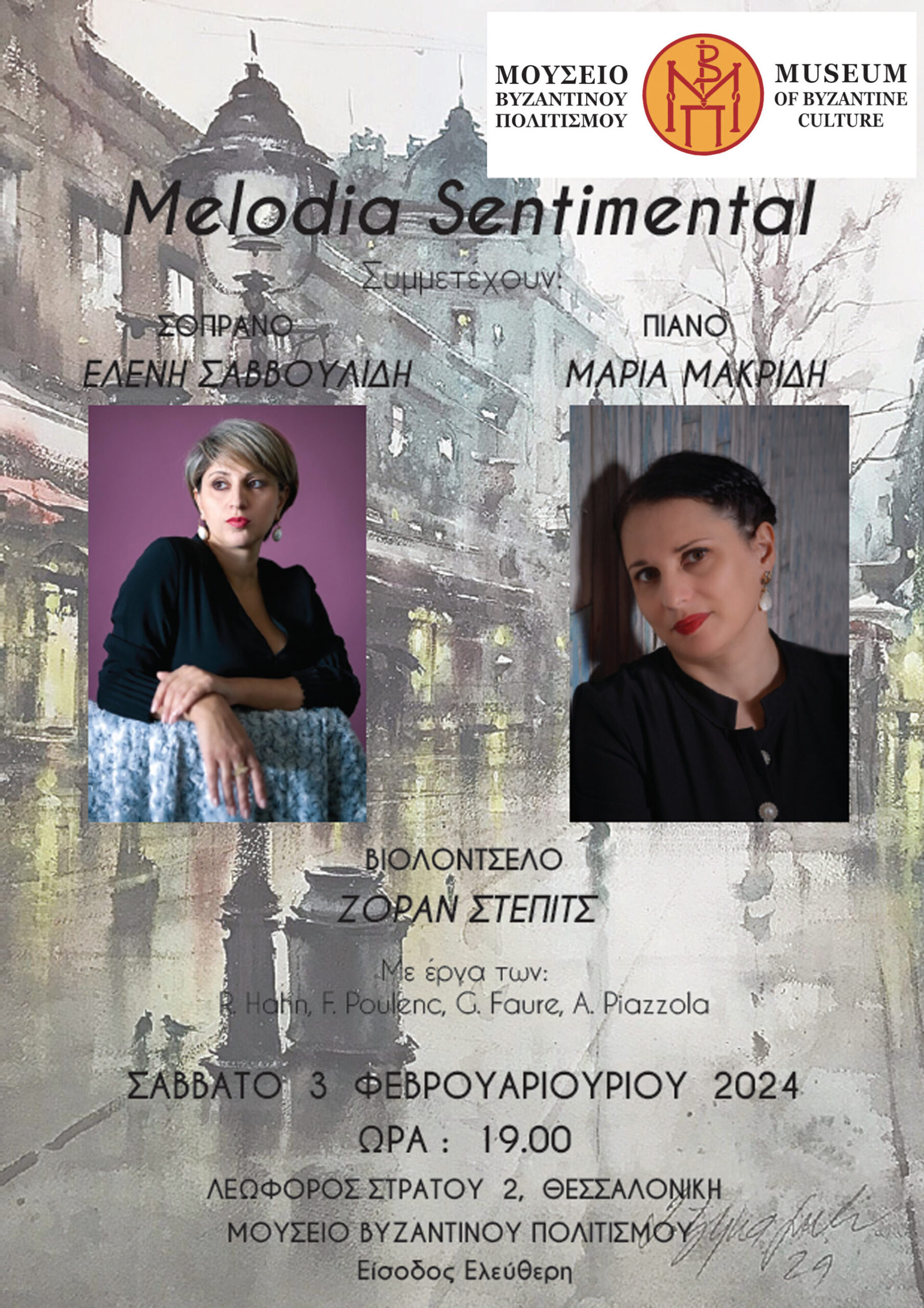 Το Μουσείο Βυζαντινού Πολιτισμού σας προσκαλεί στη μουσική βραδιά με τίτλο MELODIA SENTIMENTAL στο αμφιθέατρο «Στέφανος Δραγούμης» το Σάββατο 3 Φεβρουαρίου 2024 και ώρα 19:00. Η συναυλία θα είναι ένα μουσικό ταξίδι στα μονοπάτια της αγάπης και του έρωτα. Οι Γάλλοι συνθέτες (R. Hahn, G. Faure, και F. Poulenc) χαρίζουν αρμονική κομψότητα στη μορφή και στη μελοποίηση του λόγου, ενώ οι A. Piazzola και H. Villa lobos το ταμπεραμέντο της Λατινικής Αμερικής. Γκάμα ρομαντικών συναισθημάτων θα χαρίσουν οι καλλιτέχνες, Ελένη Σαββουλίδη (λυρική σοπράνο, διπλωματούχος μονωδίας), Μαρία Μακρίδη (διπλωματούχος καθηγήτρια πιάνου), Ζόραν Στέπιτς (τσελίστας της Κ.Ο.Θ. ).