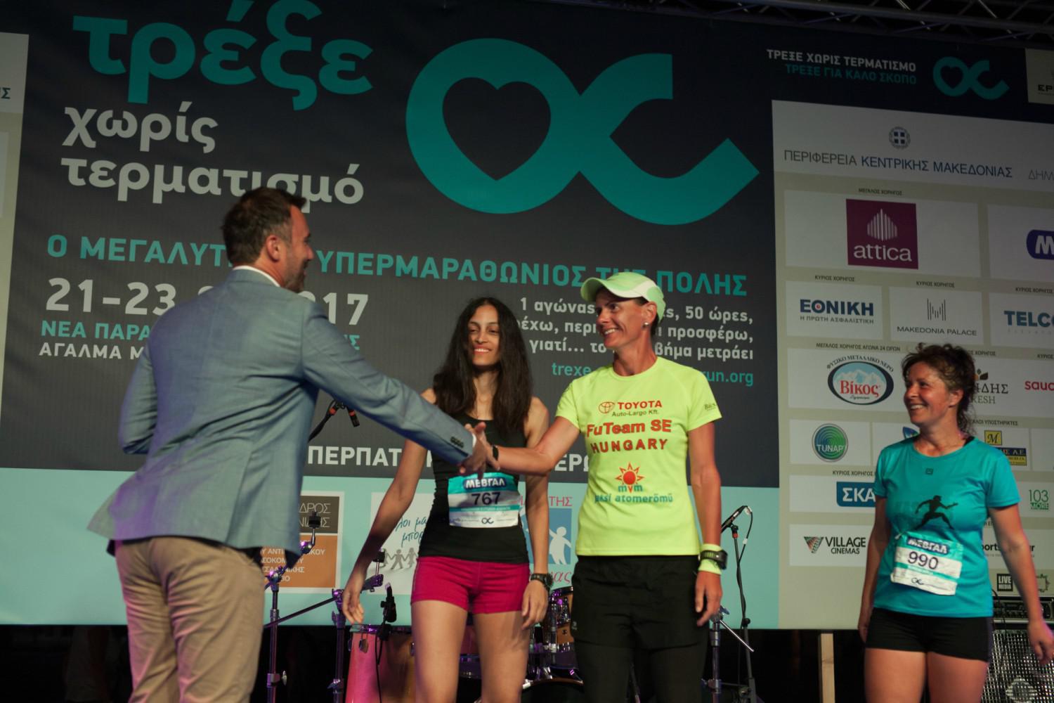 Η αυλαία του Τρέξε Χωρίς Τερματισμό έπεσε με τις απονομές στους νικητές του αγώνα των 24 ωρών, των 50 ωρών, αλλά και στις ομάδες που συμμετείχαν, με τον Γιώργο Καπουτζίδη να παρουσιάζει την εκδήλωση στη σκηνή που είχε στηθεί στο άγαλμα του Μεγάλου Αλεξάνδρου.