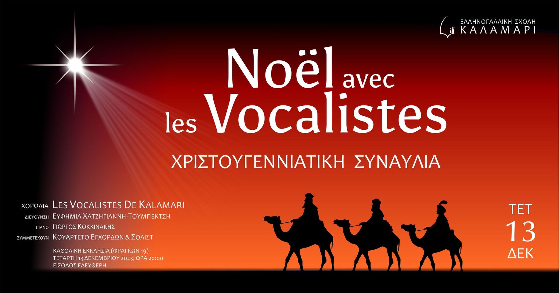 Οι μέρες αυτές είναι οι πιο χαρούμενες του χρόνου. Μέρες ελπίδας, μέρες αγάπης, μέρες που γιορτάζουν όλοι μικροί και μεγάλοι. Ελάτε να ζήσουμε μαζί την μαγεία των Χριστουγέννων στην καθιερωμένη πλέον συναυλία “Noël avec les Vocalistes”, που διοργανώνει η Ελληνογαλλική Σχολή Καλαμαρί. Αφήστε τον εαυτό σας να συγκινηθεί από κλασικά και αγαπημένα χριστουγεννιάτικα τραγούδια που θα ερμηνεύσει η χορωδία μας Les Vocalistes de Kalamari συνοδευόμενη από υπέροχους μουσικούς και σολίστες.