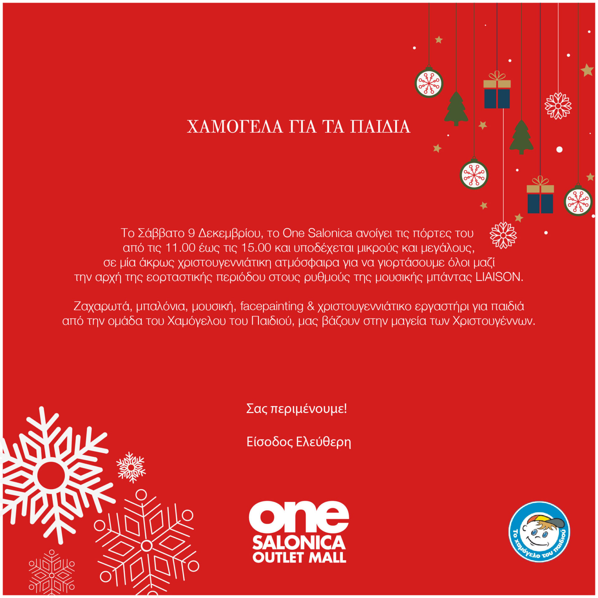 Το Σάββατο 9 Δεκεμβρίου, το One Salonica ανοίγει τις πόρτες του από τις 11.00 έως τις 15.00 και υποδέχεται μικρούς και μεγάλους σε μία άκρως χριστουγεννιάτικη ατμόσφαιρα για να γιορτάσετε όλοι μαζί την αρχή της εορταστικής περιόδου στους ρυθμούς της μουσικής μπάντας «LIAISON».
