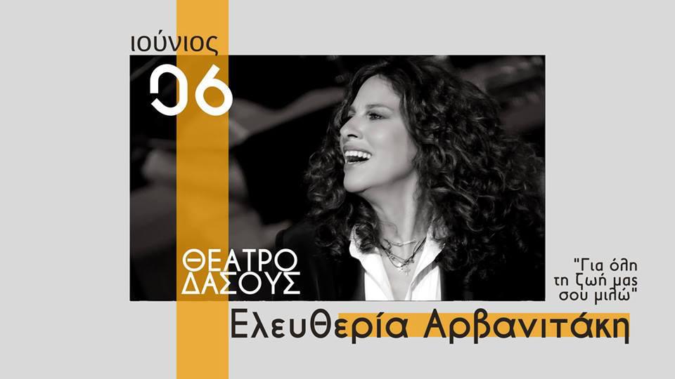 H Ελευθερία Αρβανιτάκη για μια μοναδική εμφάνιση στο Θέατρο Δάσους. Η παράσταση “Για όλη τη ζωή μας σου μιλώ”, μετά τα απανωτά sold out στο Gazarte στην Αθήνα , αλλά και στην Κύπρο τώρα και στην Θεσσαλονίκη. Η Ελευθερία Αρβανιτάκη υπόσχεται μια χορταστική συναυλία γεμάτη από τα “κλασσικά”, μεγάλα της τραγούδια, αλλά και με τα δύο καινούρια τραγούδια που κυκλοφόρησαν πρόσφατα.